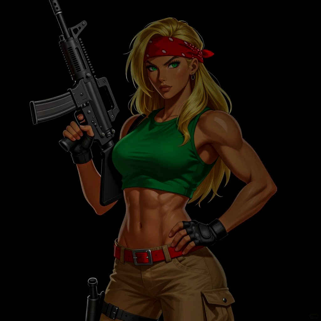 Digital illustration of a muscular blonde woman with green eyes, holding a black assault rifle in her right hand. She has long, flowing hair, a red bandana, a green sleeveless crop top, and black fingerless gloves. Her tan pants are unbuttoned, revealing a red waistband. She stands against a black background with a confident expression. Her left hand rests on her hip. She has defined abs and a determined look. The rifle is angled upwards. She is the only person in the image.