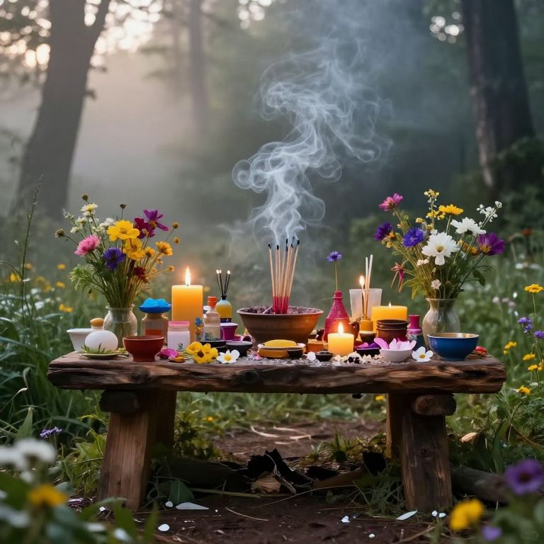 Votive offerings arranged meticulously on a rustic wooden altar, surrounded by blooming wildflowers, incense smoke curling upwards in a misty forest clearing at dawn, creating a mystical and serene atmosphere filled with spiritual energy.