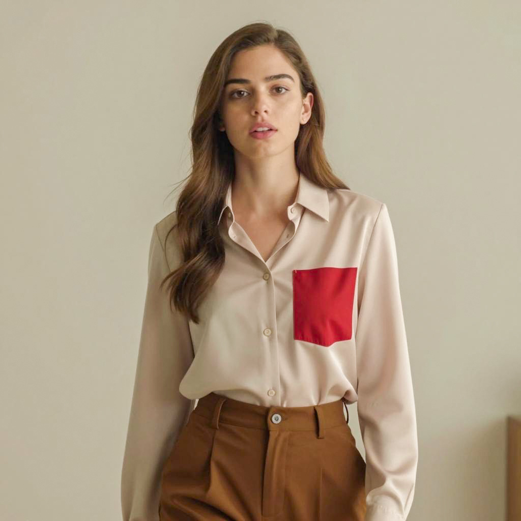 Movie day costume, photograph of a young woman with long brown hair, wearing a beige satin blouse with a large red rectangle pocket, brown high-waisted pants, standing in front of a plain beige background, soft natural light, realistic, casual style, slightly parted lips, focused expression, medium shot, minimalist, subtle shadows, soft ure, neutral colors