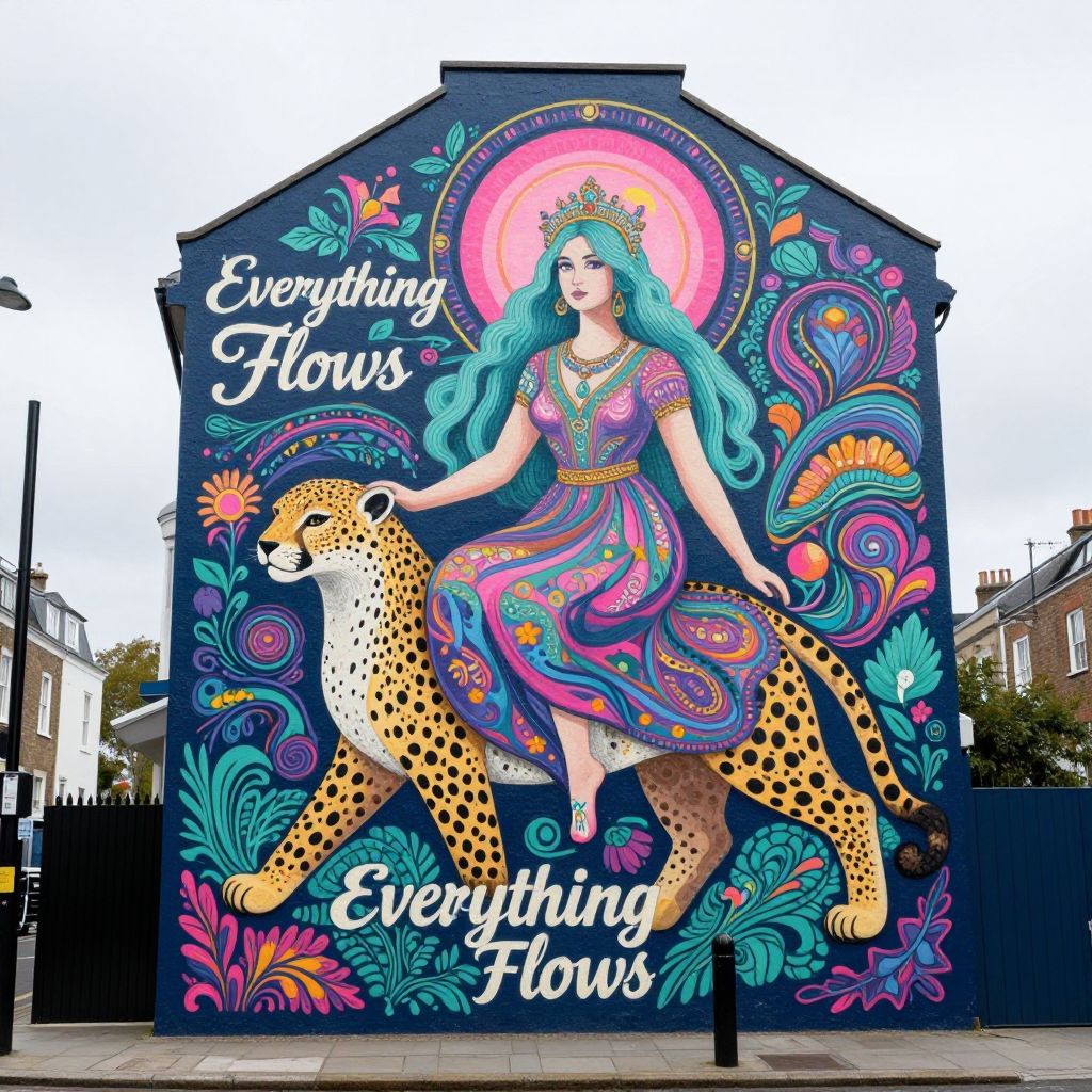 Vibrant mural of a blue-haired woman in a colorful dress holding a cheetah, surrounded by psychedelic patterns, with "Everything Flows"