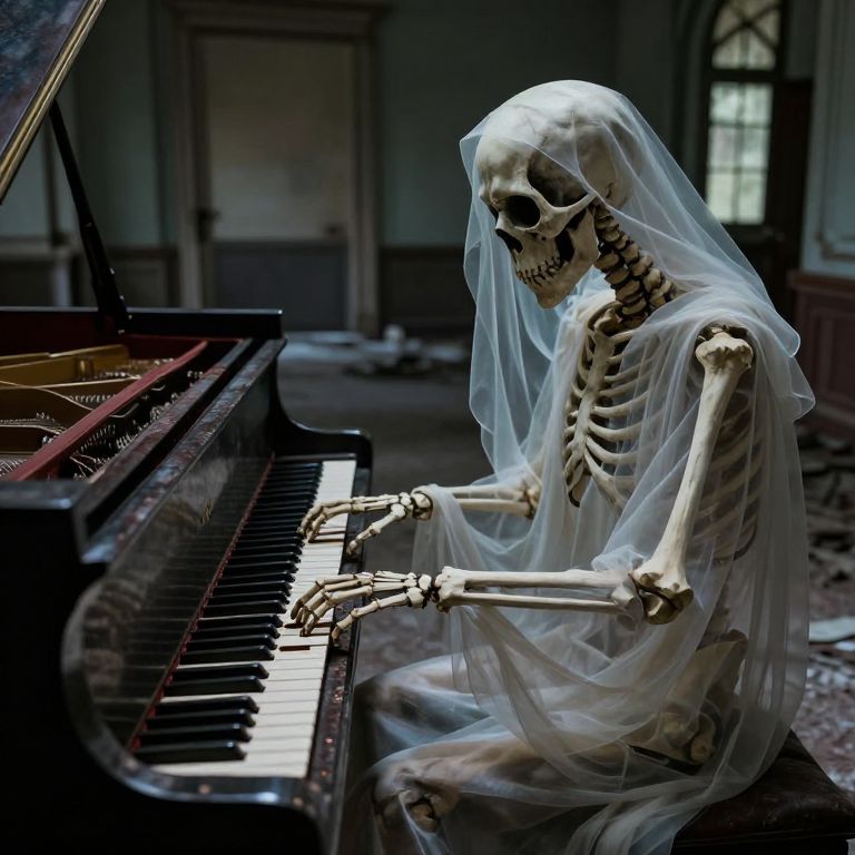 In the haunting embrace of an abandoned opera house, a skeletal figure draped in ethereal robes sits before a decaying grand piano, its fingers brushing over dusty keys that echo with the mournful symphony of lost souls, evoking a profound sense of melancholy and the timeless dance between life, death, and the enduring power of music.