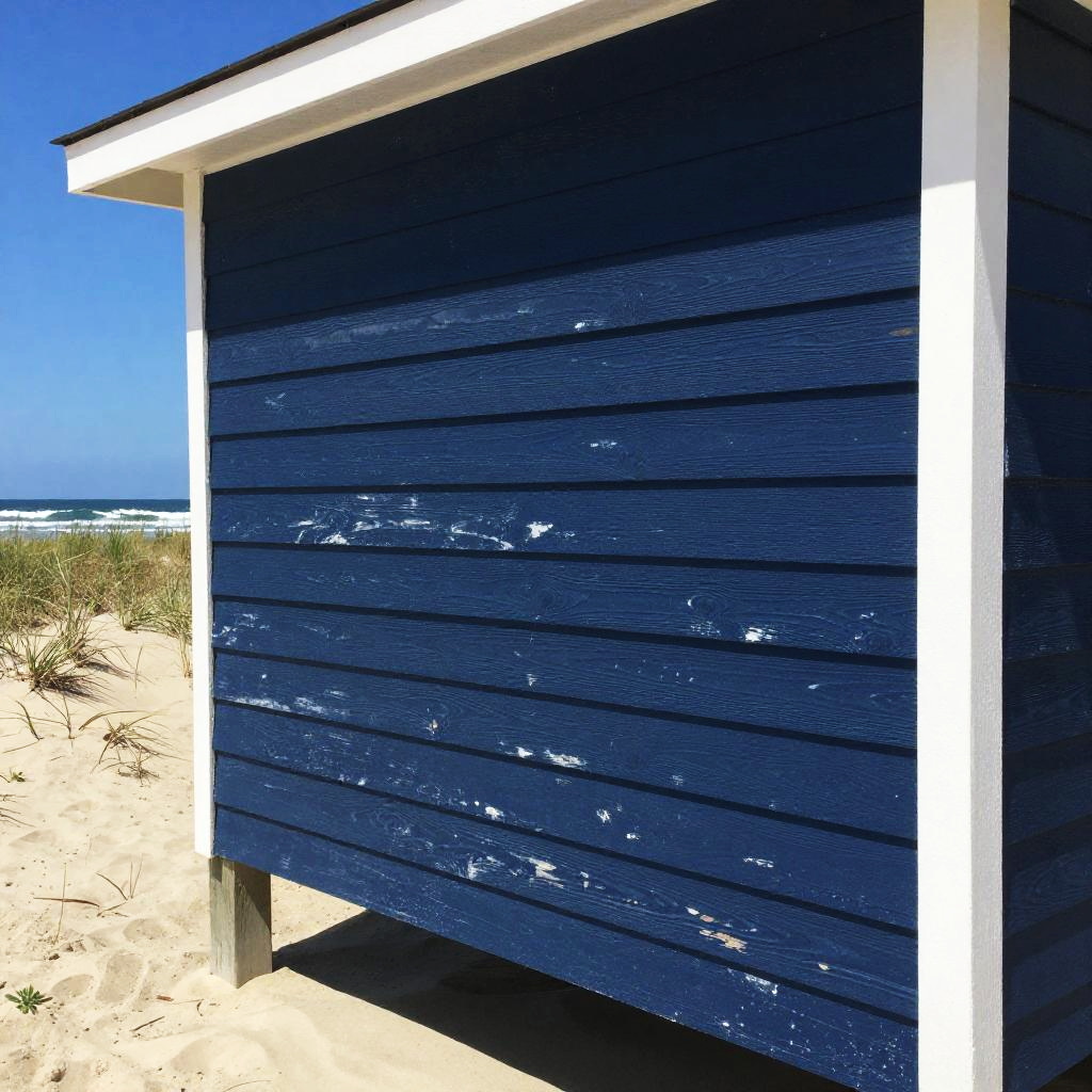 Navy blue siding on a beach house, weathered wood texture, bright sunlight, surrounded by sand dunes and ocean waves, vibrant and lively coastal atmosphere, high resolution