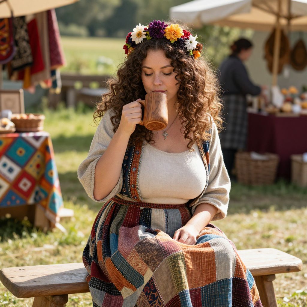 A serene woman with a rich, voluminous curly hairstyle, wearing a rustic festival costume of patchwork fabrics and floral headdresses, sitting on a handmade wooden bench in a sunny countryside market, surrounded by colorful stalls, her face is peaceful and calm, the curls are soft and natural, catching sunlight as she sips from a wooden mug. The woman has big breasts and cute face