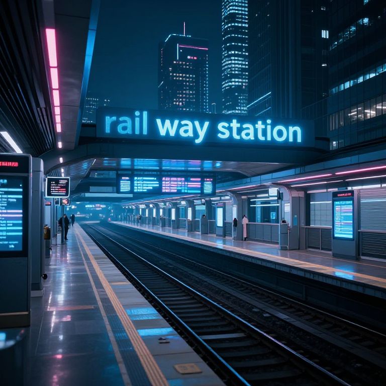 A futuristic railway station in a cyberpunk city, glowing neon signs, automated platforms, and holographic schedules. The keyword 'railway station' stands at the heart of the urban landscape, blending high-tech infrastructure with sleek, modern design.