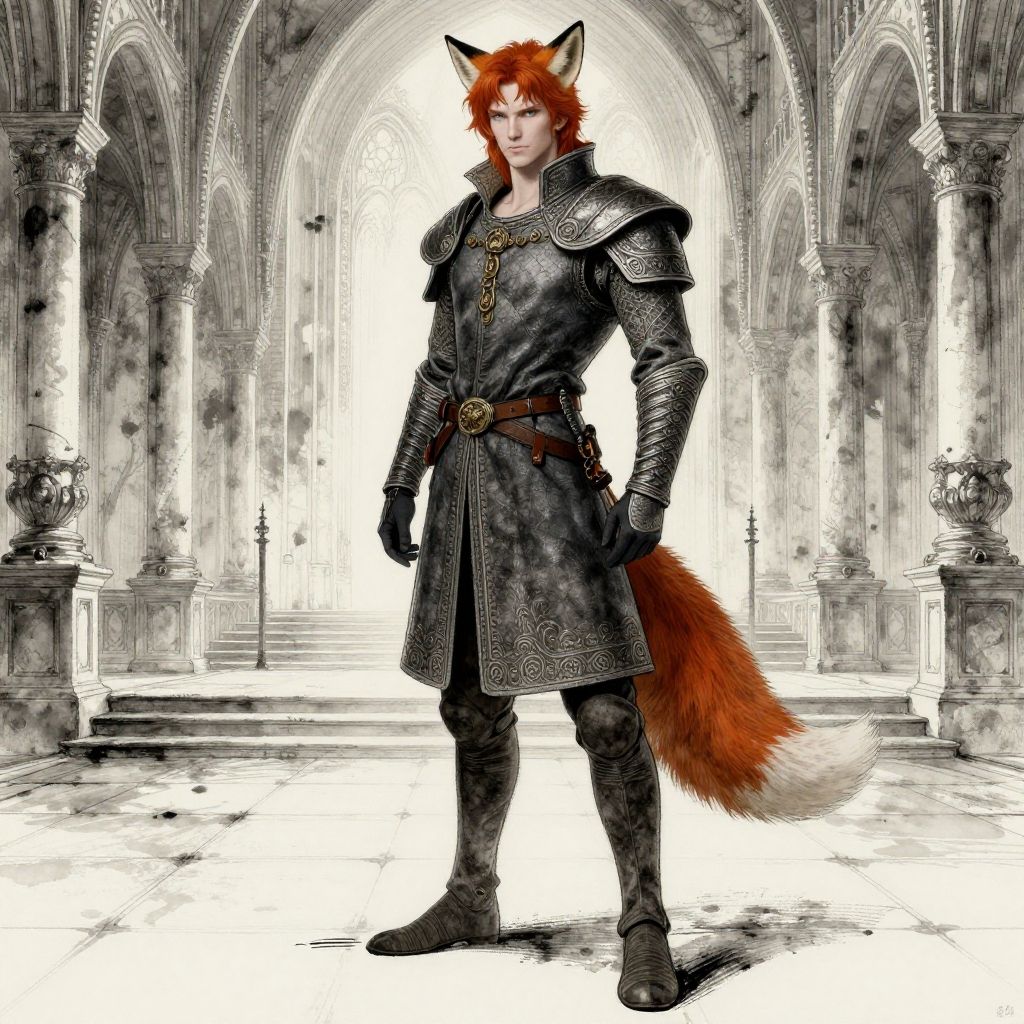 Fullbody:1.2 male noble man, (red hair), pale skin, fox hears, fox tail, blue eyes, detailed face, (realistic details:1.5), noble hall, ultra detailed, 8k, illustration, ink art, medieval fantasy