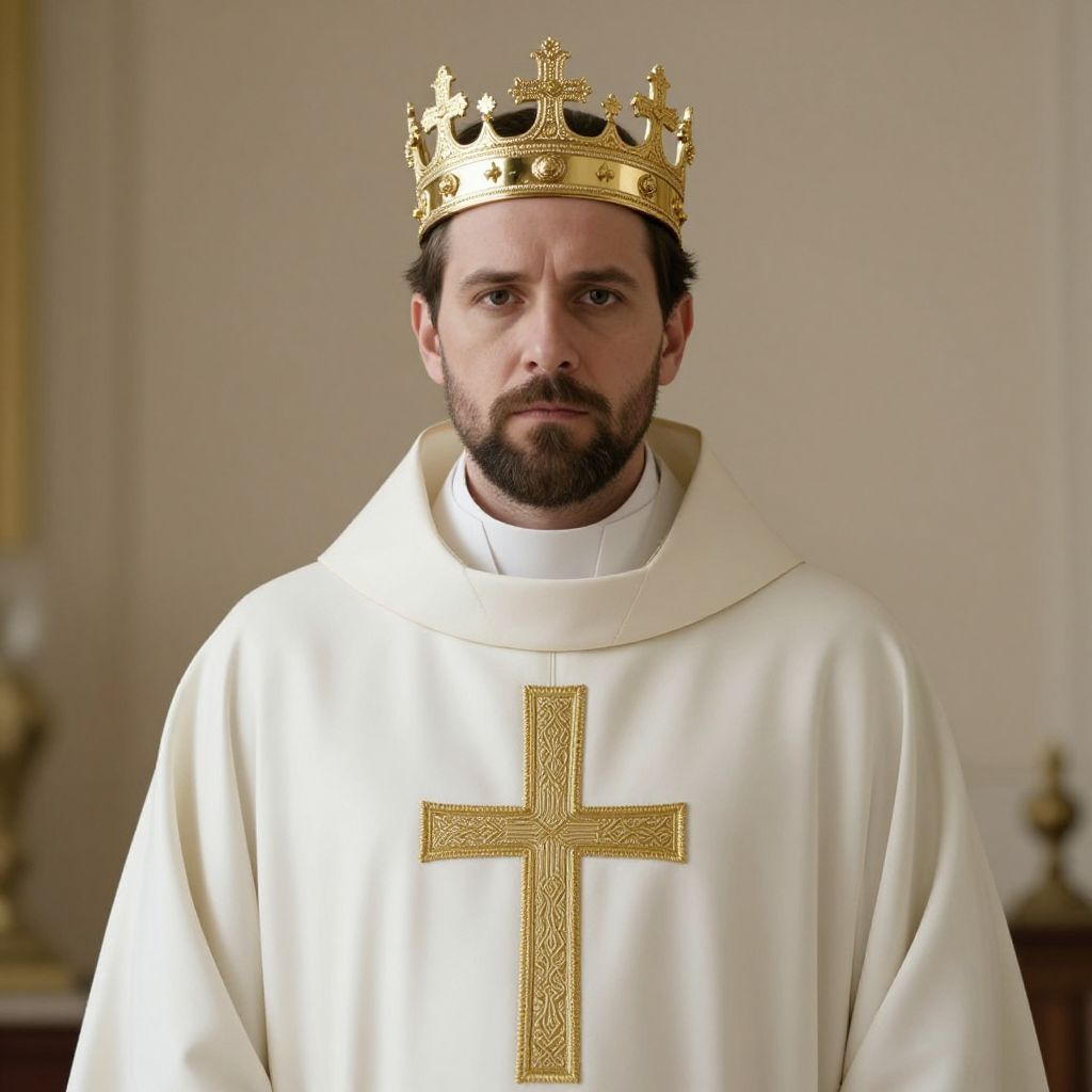 A photograph of a serious-looking man with a trimmed beard and dark hair, wearing a gold crown and a white clerical robe with gold trim and a central gold cross. He stands in a softly lit, beige-colored room with a blurred background. The robe's fabric looks smooth and slightly reflective, adding a touch of elegance to his solemn expression.
