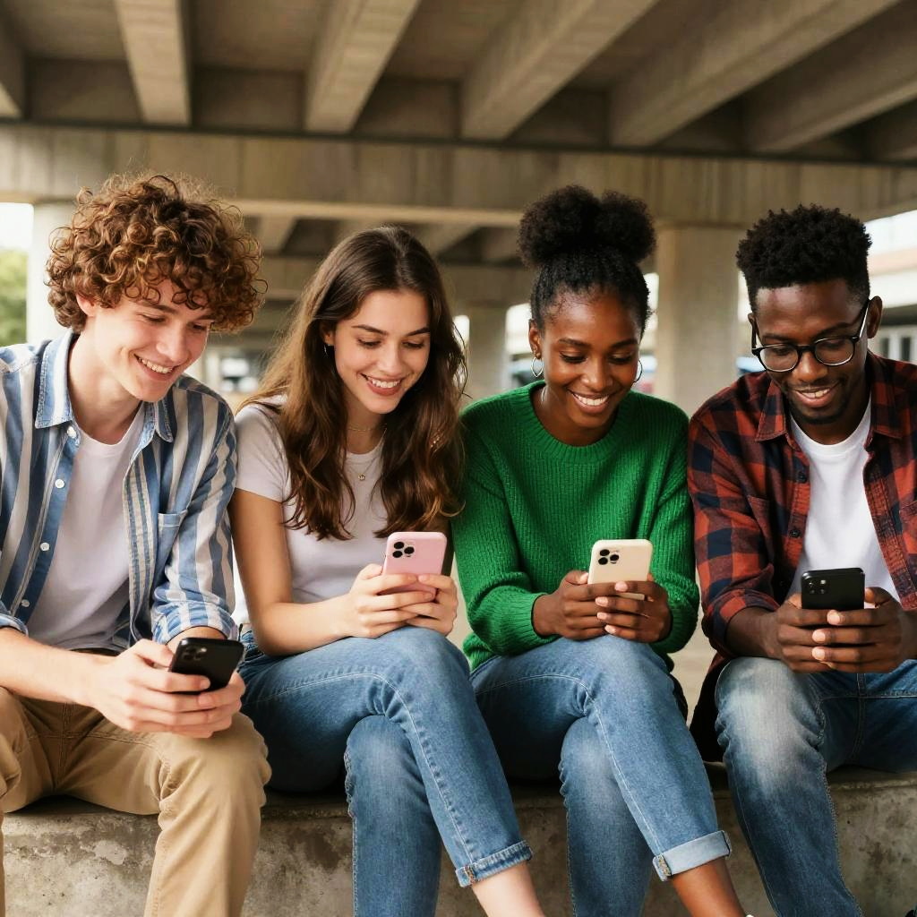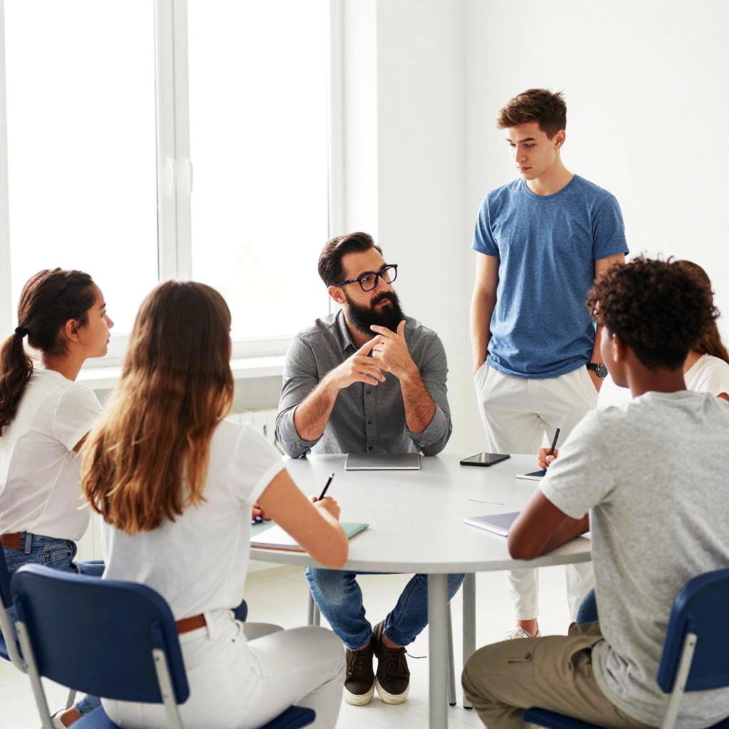 This is a photo of five young adults, three men and two women, sitting around a wooden table in a modern, indoor setting. They're all smiling and engaged, working on laptops. One guy on the left has a red hoodie with yellow headphones, another in the middle has a man bun and beard, wearing a blue shirt and headphones. A red cup is on the table.