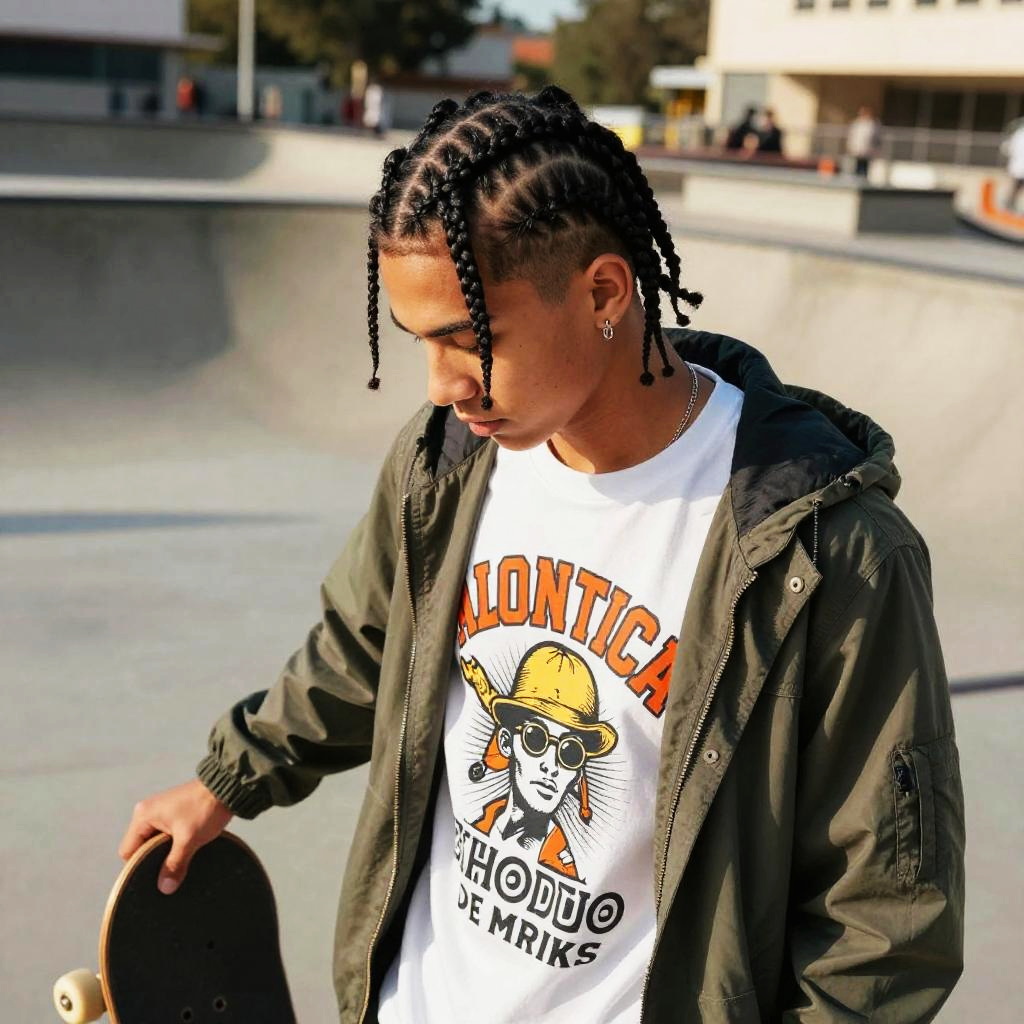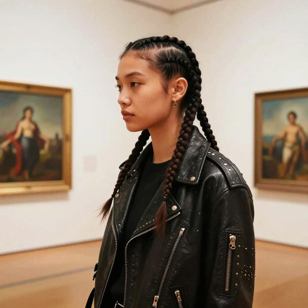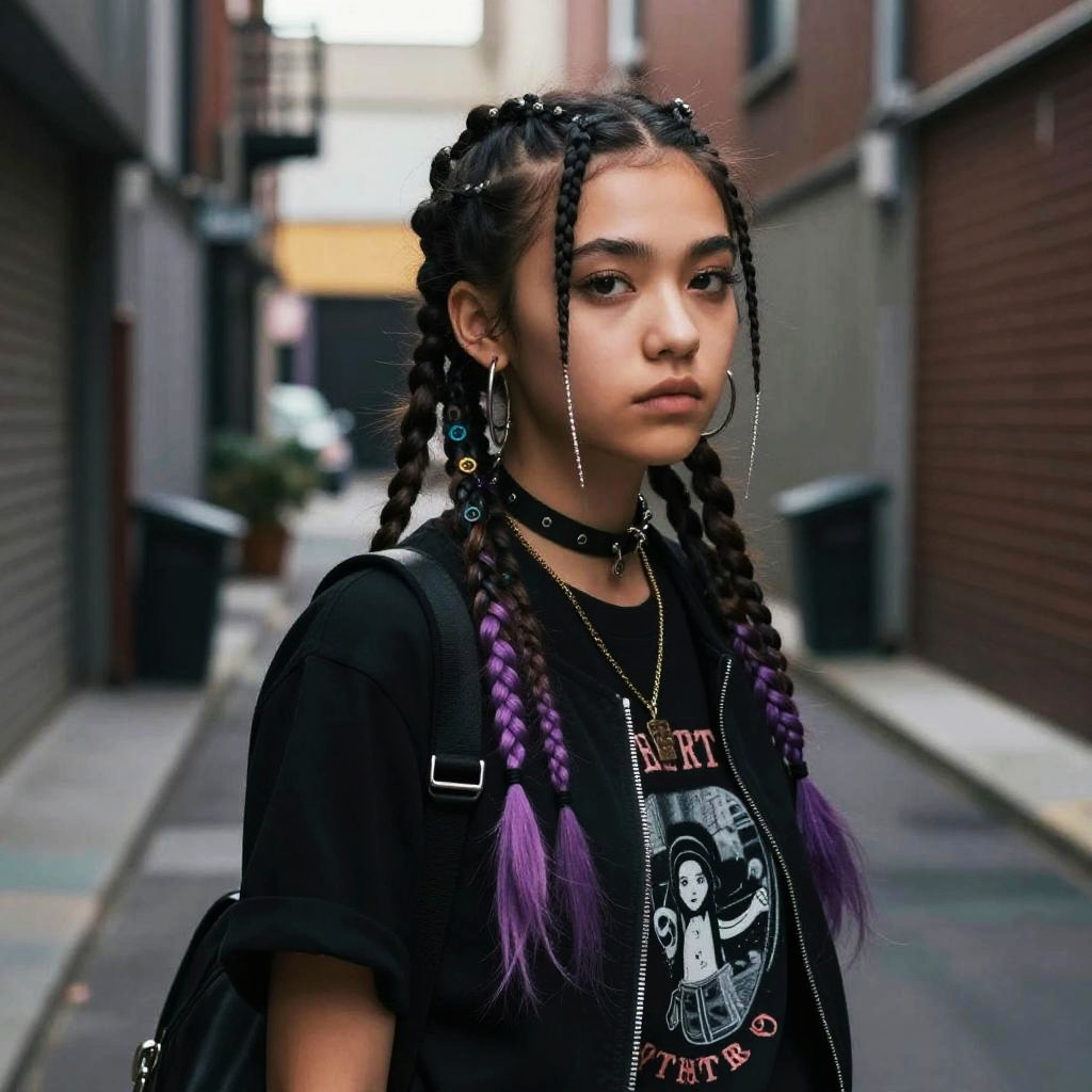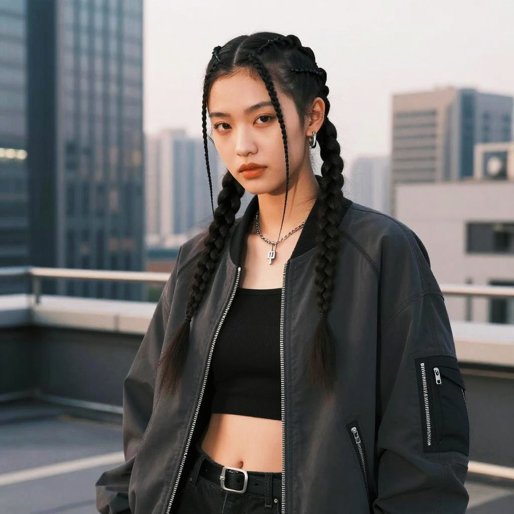 Micro Braids hairstyle on young female athlete, wearing sporty tracksuit, in modern gym, captured in fashion editorial style with bright fluorescent lighting.