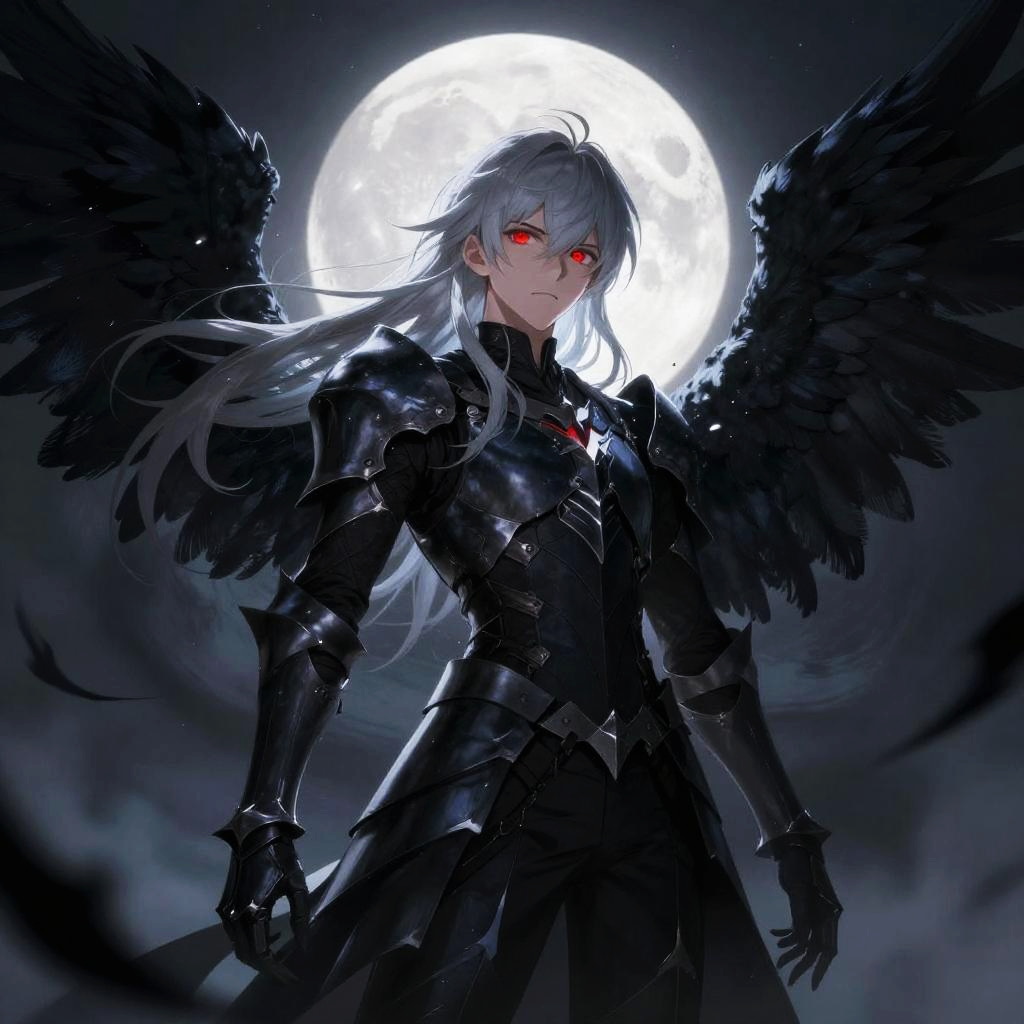 Anime black wings glowing faintly under moonlight, character with flowing silver hair and sharp crimson eyes, dressed in dark armor, surrounded by swirling shadows, high detail, cinematic lighting