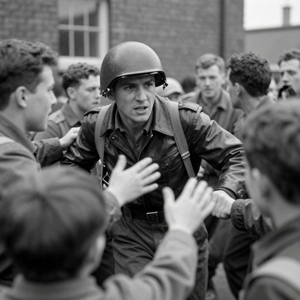 Black-and-white photograph of a World War II soldier in a helmet and leather jacket, pushing through a crowd of civilians. The soldier's expression is determined, and civilians reach out towards him. Background includes a brick building with a visible window. The scene is chaotic, with blurred motion capturing the urgency and intensity of the moment.