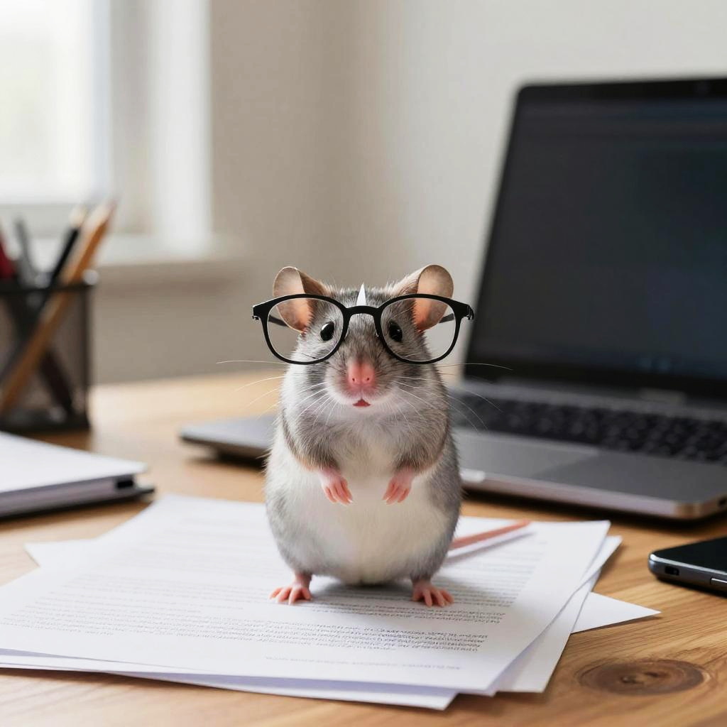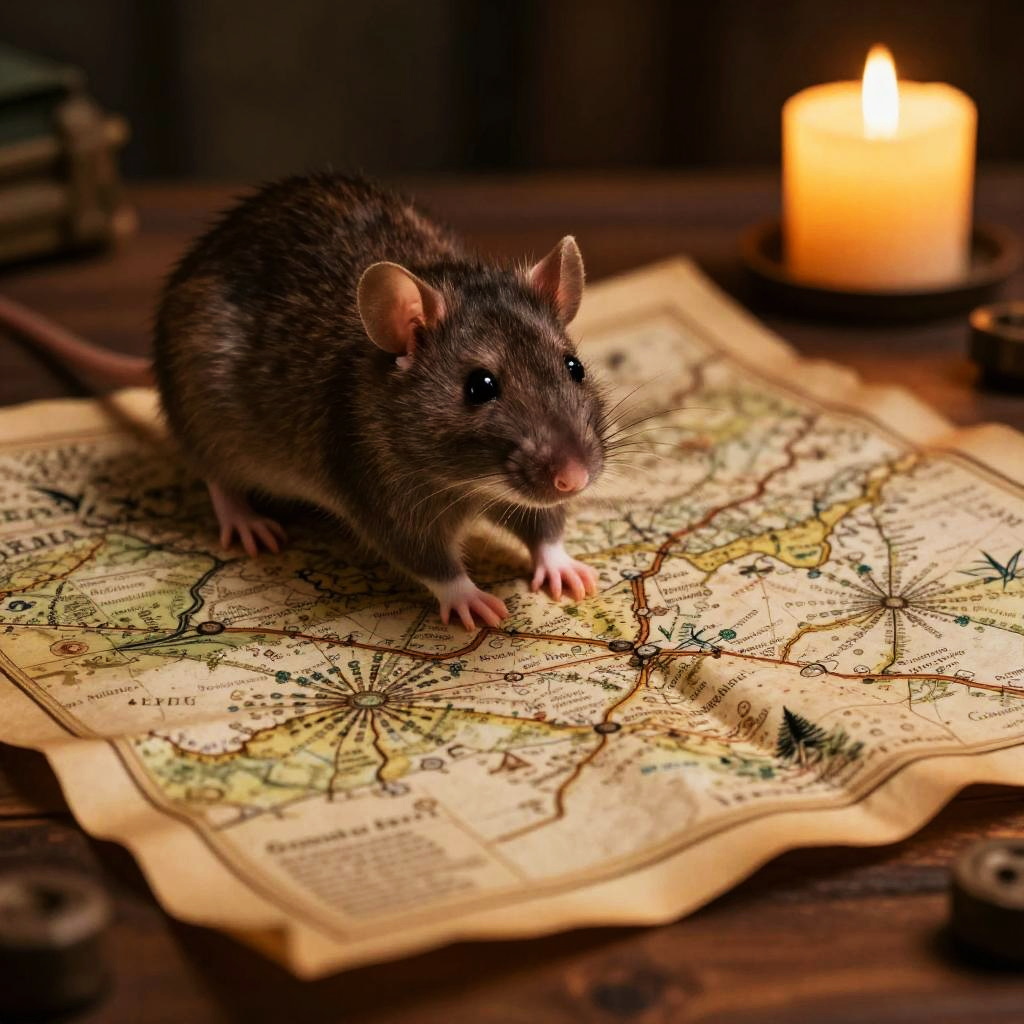 Photograph of a small, dark brown rat with black eyes and pink ears, standing on an antique, yellowed map with detailed, green and brown line work. The rat's front paws rest on the map, which is slightly wrinkled. In the background, a glowing, orange candle casts a warm light, creating soft shadows. The wooden table is dark and textured, with small, scattered objects in the periphery. The candle is positioned to the right, slightly out of focus, adding a cozy, mystical atmosphere to the scene.