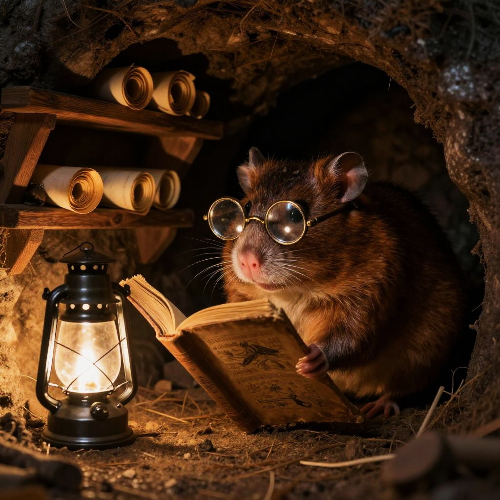 Close-up of a clever rat pointing at an ancient map on a wooden table, dimly lit room, intricate details on the map, warm candlelight casting shadows, cozy adventure scene, realistic animals.