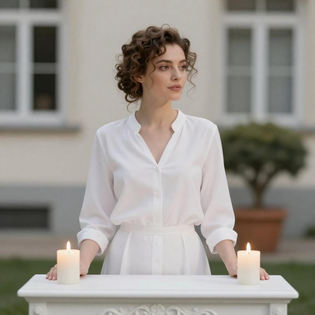 Photograph of a woman with fair skin and curly brown hair styled in an updo, wearing a white blouse. She stands behind an ornate white table with two lit candles, looking slightly to the right. The blurred background features a building with windows and potted plants.