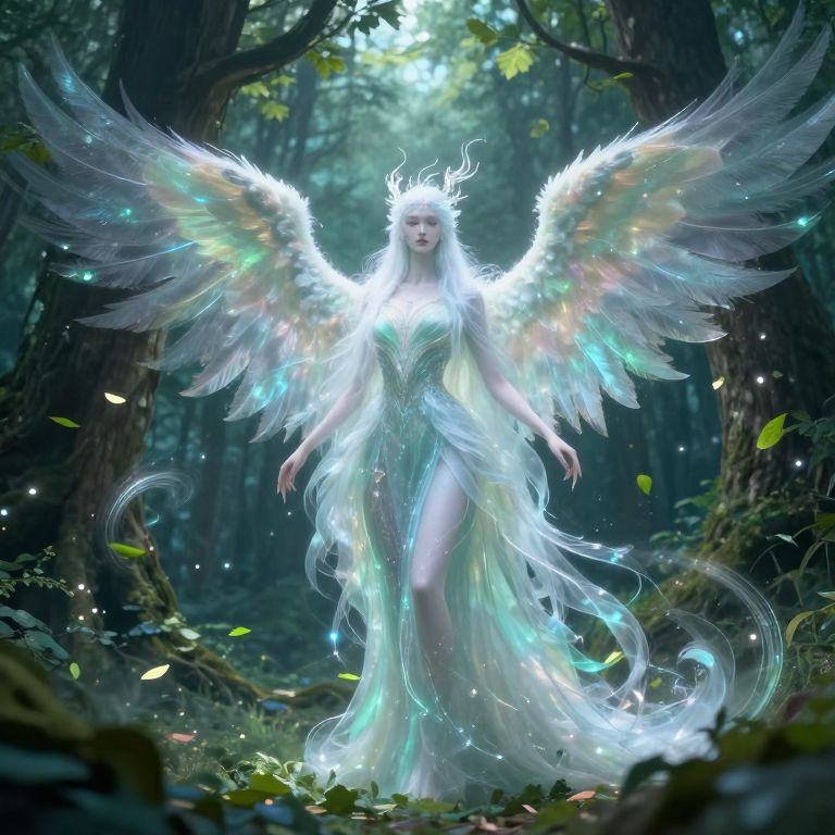Wendigio as a guardian spirit of an ancient forest, ethereal and towering with translucent feathers, surrounded by swirling leaves and magical light particles, fantasy surreal art style, vivid colors, and soft glowing highlights