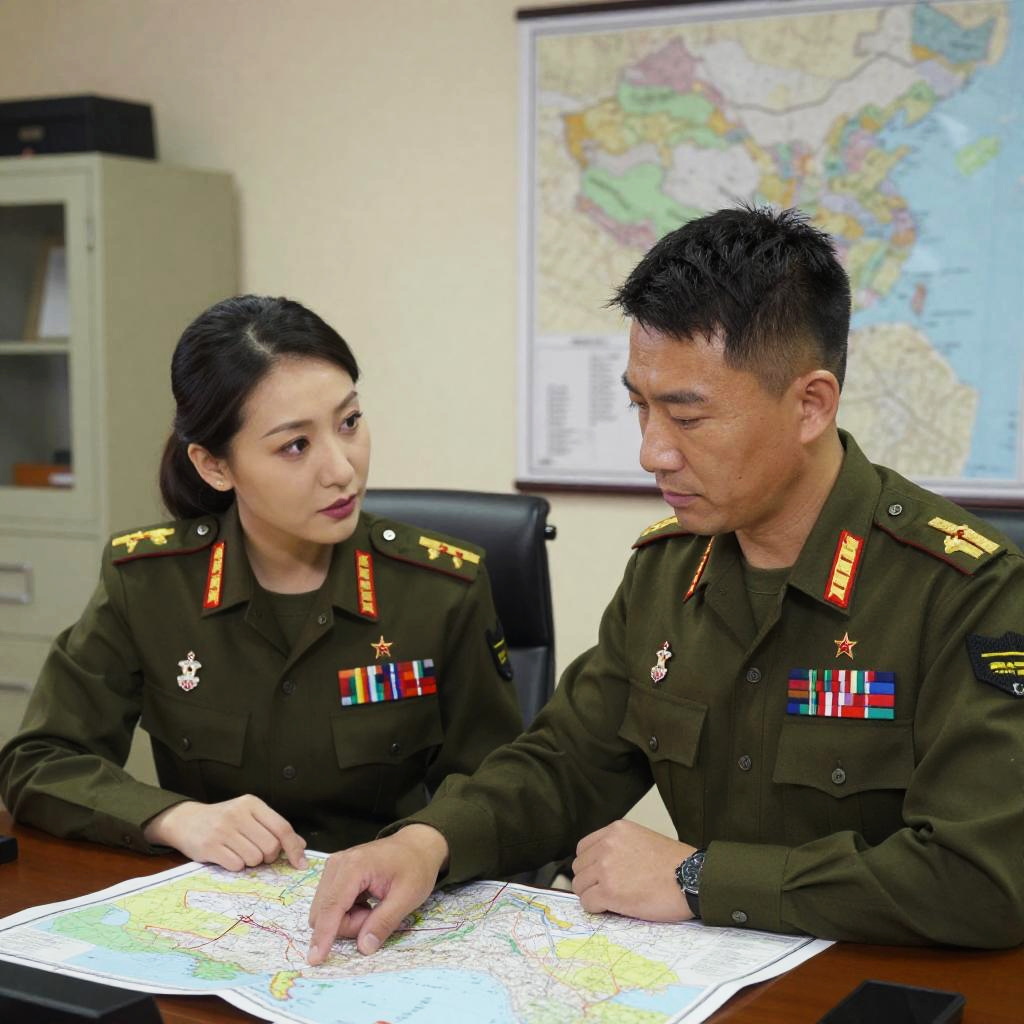 Photograph of two Asian military officers, a man and a woman, sitting at a wooden desk in an office. Both wear olive-green military uniforms with various colorful ribbons, stars, and insignias on their chests. The woman, with straight black hair tied back, points at a detailed map on the desk. The man, with short black hair, looks at the map attentively. The background features a beige wall, a white filing cabinet, and a large map of the United States. The room is brightly lit, emphasizing the formal and professional setting.