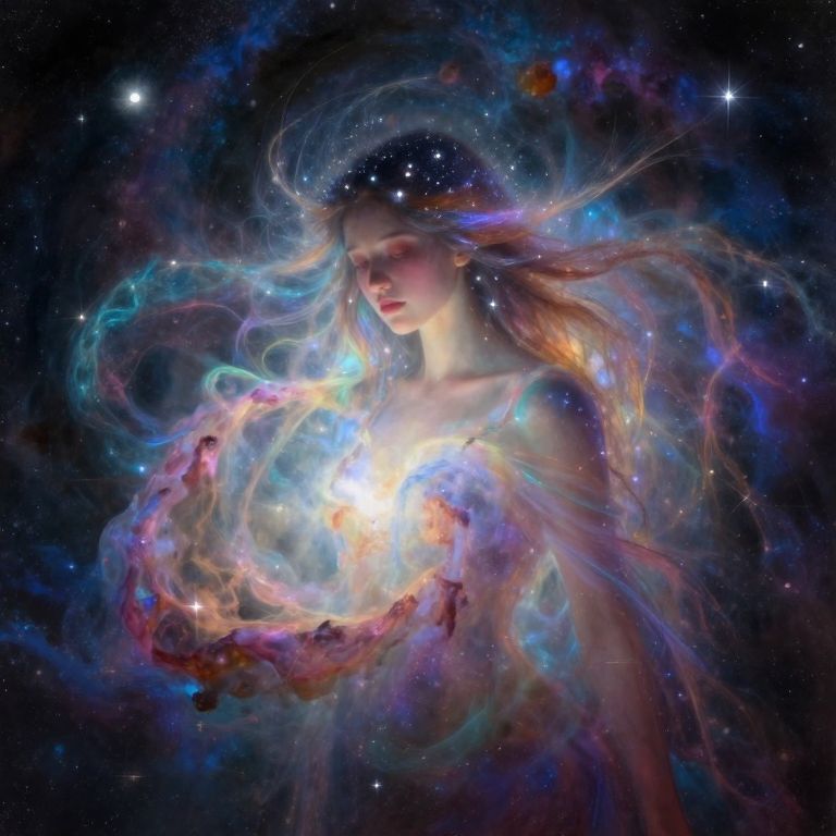 Digital art of ethereal, glowing female spirits dancing around a bright, colorful spiral galaxy in a starry, dark space backdrop.