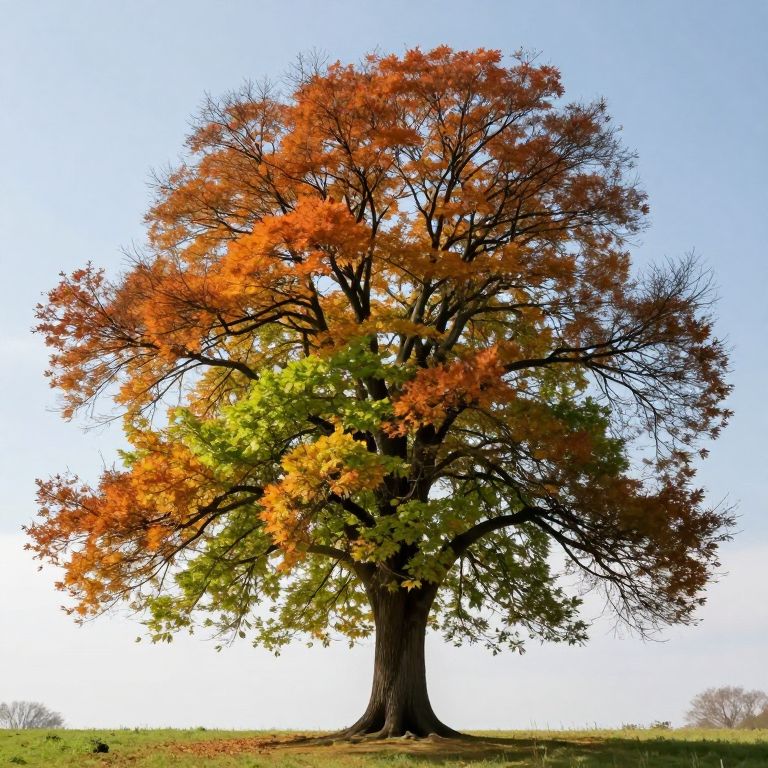 Photograph of a large, central oak tree with vibrant autumn leaves in orange and green, set against a clear blue sky.