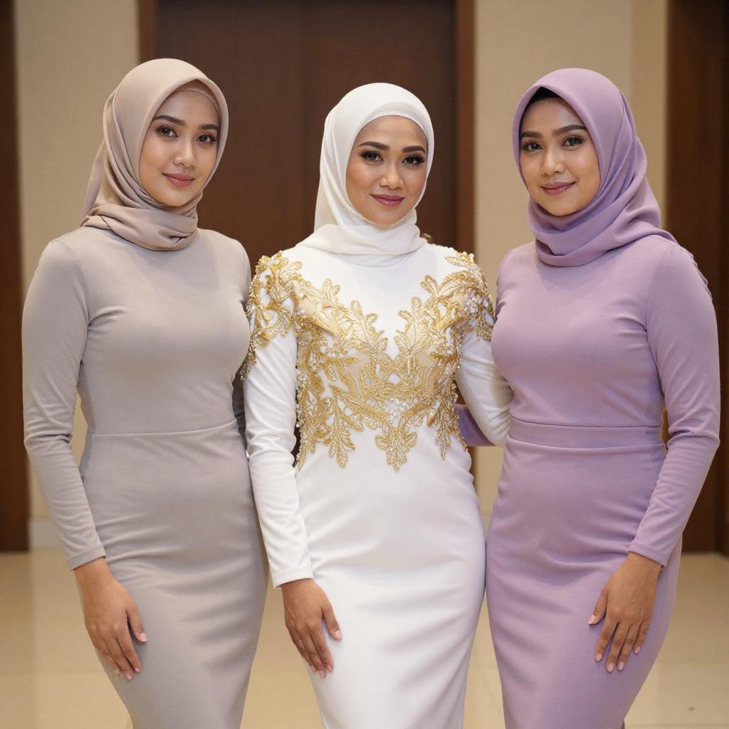 Photograph of three Asian women standing close together. They wear hijabs in beige, white, and lavender, and form-fitting dresses in gray, white with gold lace, and lavender. All have curvy figures, smiling, and standing in a warmly lit indoor setting.