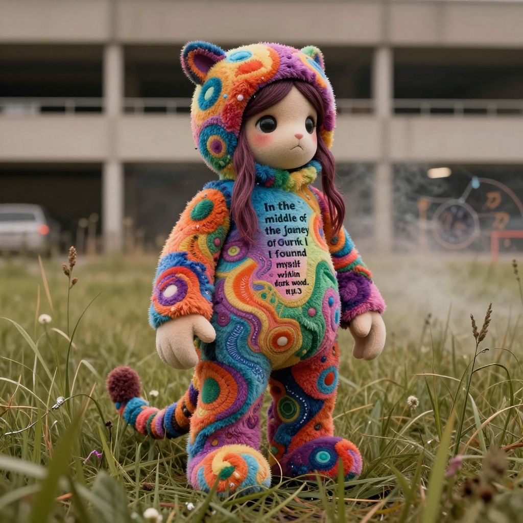 Photograph of a doll standing in grassy field, wearing a vibrant, multicolored, fuzzy onesie with psychedelic patterns and bear-like ears and tail. The onesie has text on the chest reading, "In the middle of the night I felt the warmth of love... is that you?". The doll has long brown hair and a neutral expression. Background features a concrete overpass with a blurred bicycle visible. The image has a soft focus, with the grass in the foreground slightly out of focus. The overall scene is colorful and whimsical.