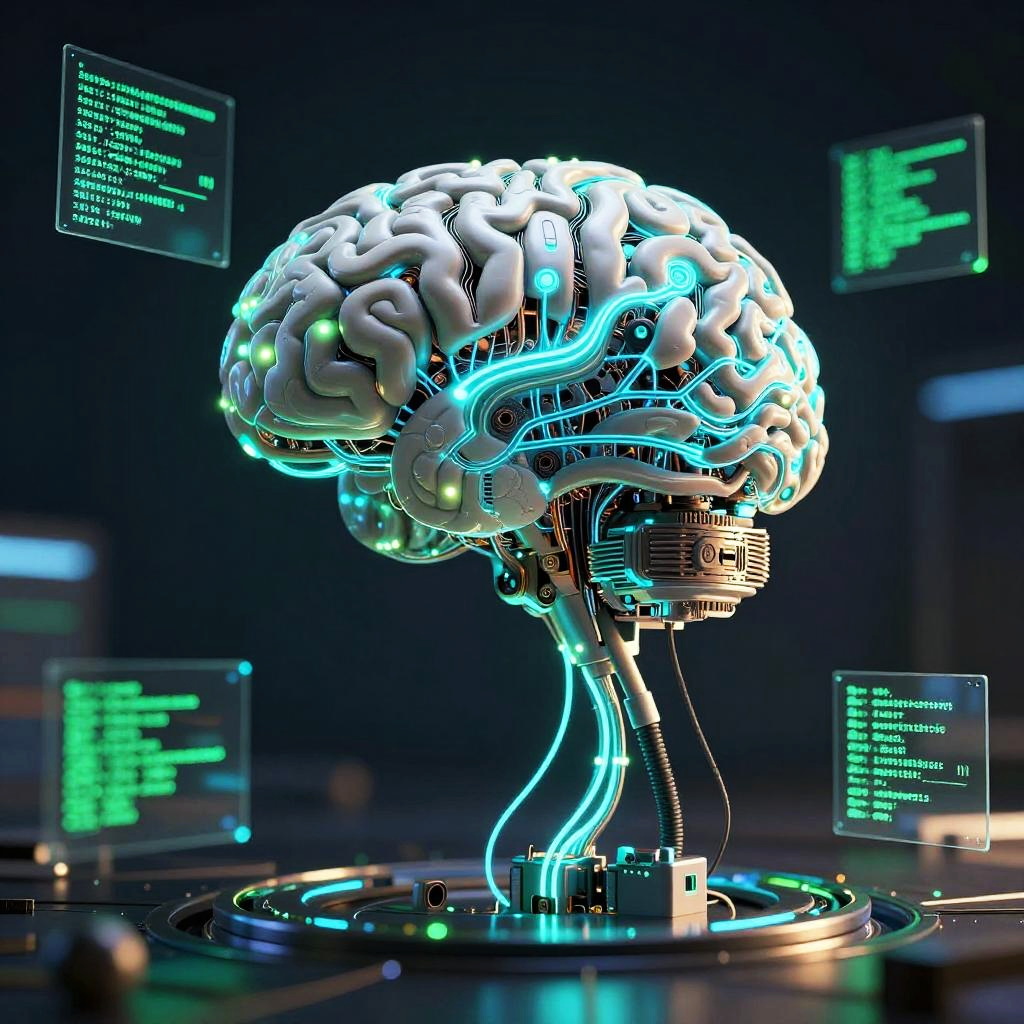 CGI illustration of a glowing, cybernetic brain with neon blue and green circuitry, surrounded by floating code screens in a dark, futuristic lab