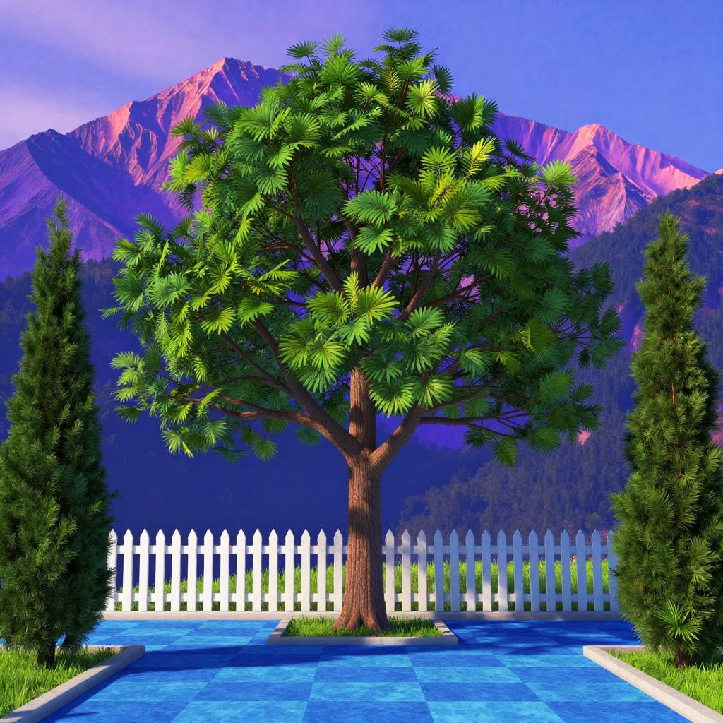 This digital art piece features a lush, green tree with a sturdy trunk and wide branches, centered in a vibrant blue courtyard with a checkered pattern. Two tall, cone-shaped evergreens stand on either side, flanking a white picket fence. Behind the tree, a majestic purple and pink mountain rises against a twilight sky. The image has a vivid, surreal style.