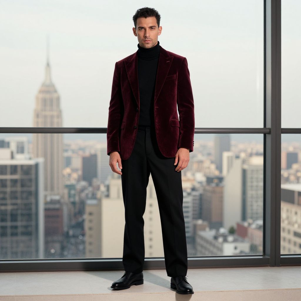 A man, burgundy velvet blazer, black turtleneck sweater, straight-leg black dress pants, matte black oxford shoes, no tie, sleek high-rises, panoramic city views, Cibachrome style, confident expression. Man has masculine face and piercing eyes