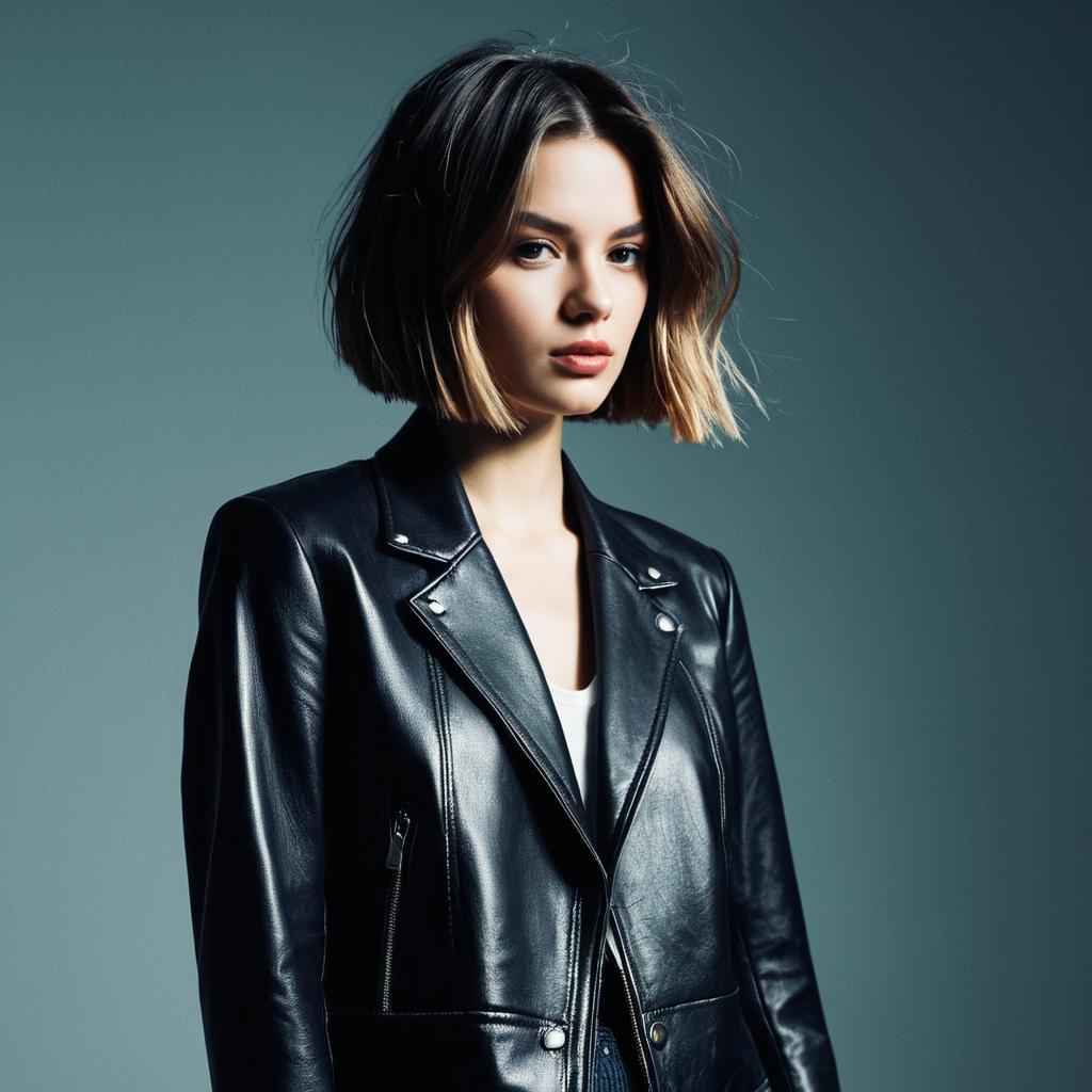 Choppy Bob hairstyle on fashion model, wearing flowing silk dress, in art studio, captured in fashion editorial style with warm golden hour lighting.