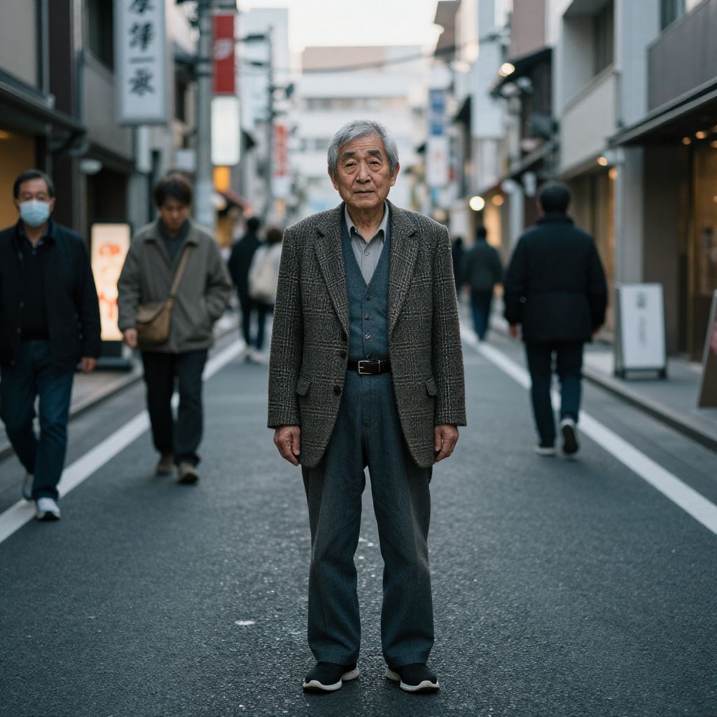 Photograph of an elderly Asian man with gray hair, wearing a checkered blazer and gray pants, standing in a bustling urban street at dusk.