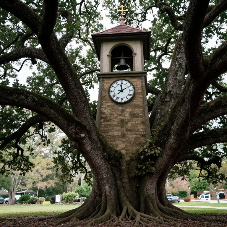 Where time and nature converge, a clock tower emerges from ancient oak roots, its chimes echoing forgotten tongues, inviting contemplation of eternity amidst the whispers of the past.