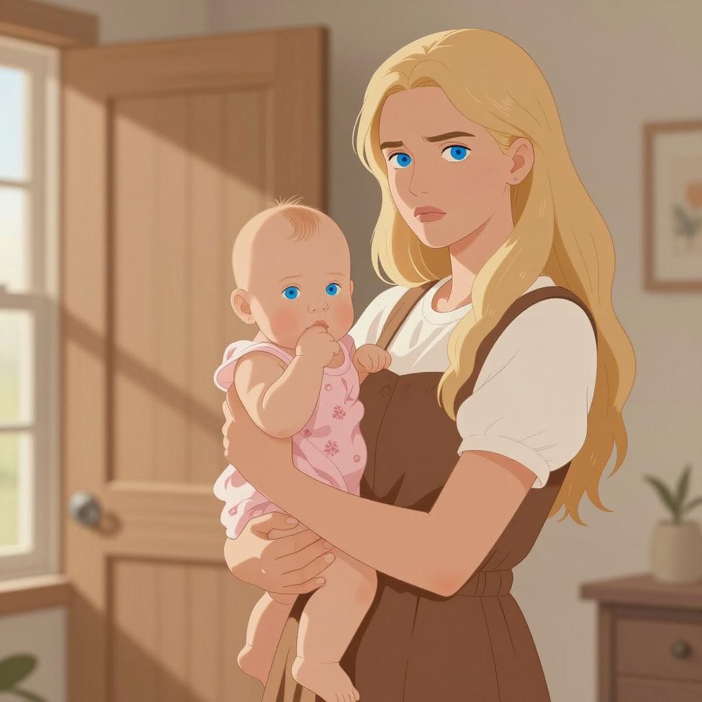 Illustration of a young woman with long blonde hair holding a baby. Woman wears a brown dress over a white blouse, baby in pink patterned clothes. Wooden interior background with sunlight through window. Woman's expression is serious, baby's expression is neutral. Woman's right hand holds baby's left arm, baby's right hand near face. Woman's eyes are blue, baby's eyes are blue. Light brown wooden door in background. Woman stands slightly to the right, baby in center. Woman's left hand rests on baby's back.