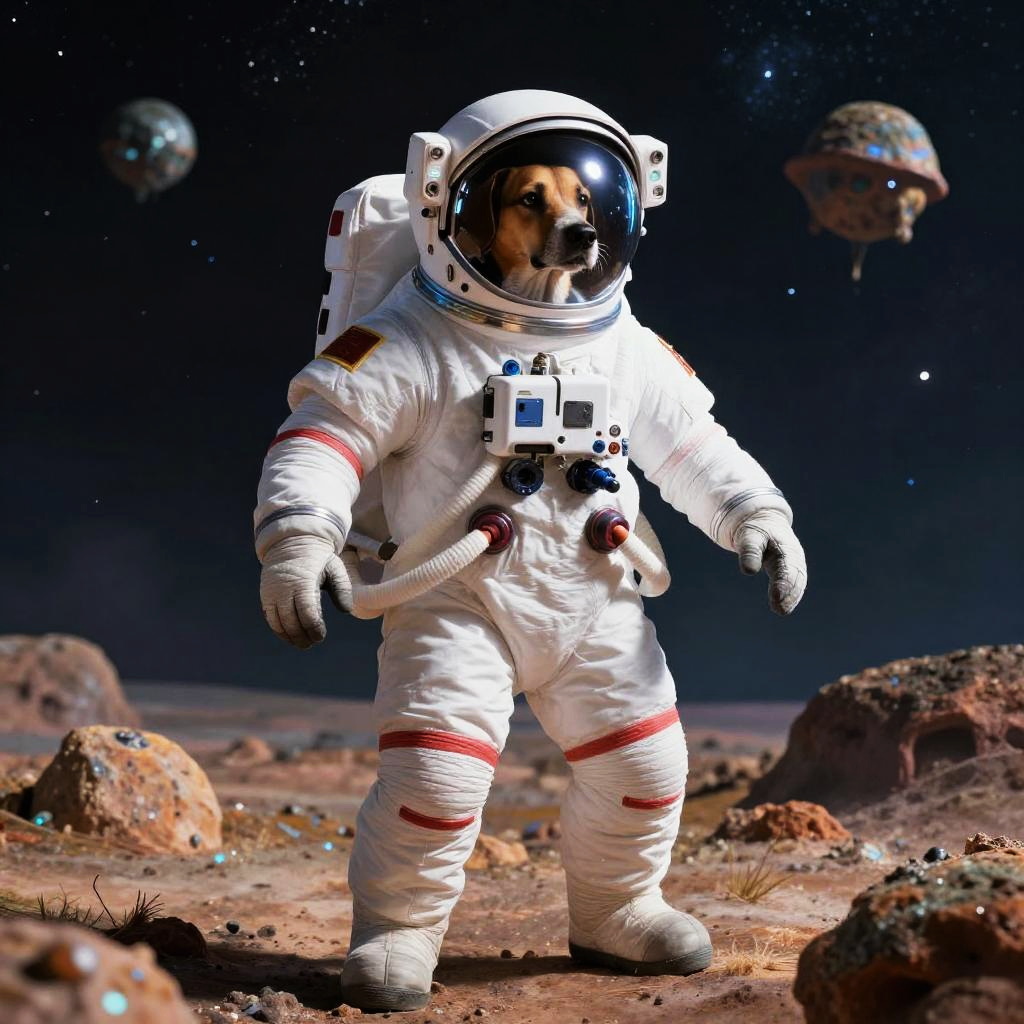 Dog space suit astronaut exploring alien planet, futuristic details, glowing helmet, starry sky background, vibrant colors, ultra-realistic sci-fi environment