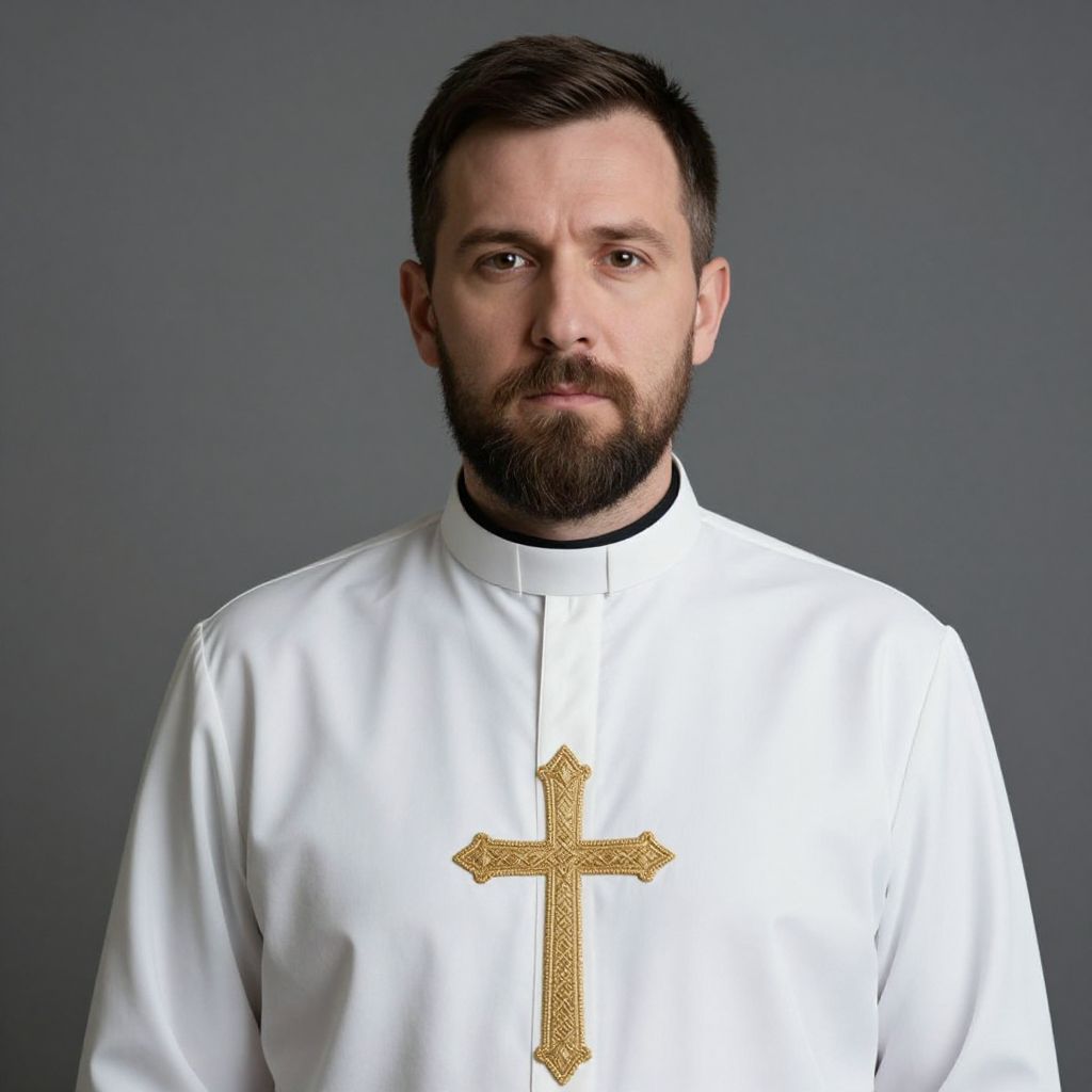 Photograph of a serious-looking Caucasian man with short dark brown hair and a full beard. He's wearing a white clerical shirt with a large gold cross embroidered on the chest, over a black high-necked shirt. The background is a plain, muted gray. His expression is calm and focused, and he looks directly at the camera. The image has a professional, studio-quality feel.