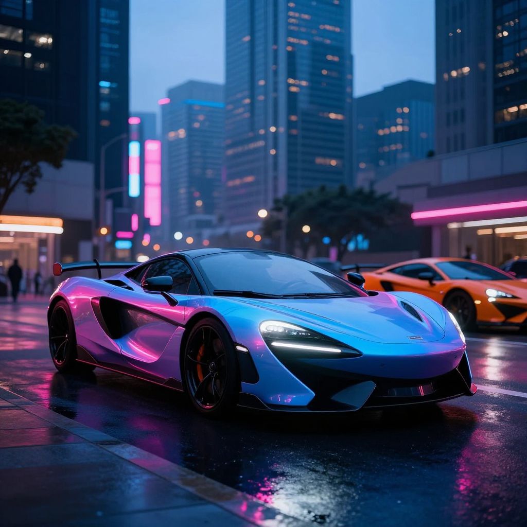 A sleek, futuristic sports car with a reflective blue and pink neon finish parked on a wet city street at twilight. The urban environment features tall skyscrapers with vibrant neon lights, contributing to a cyberpunk atmosphere. Another orange sports car is visible in the background.