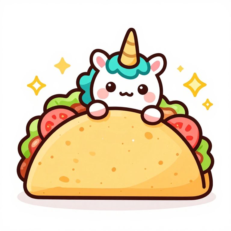 The image is a highly detailed, vector-based illustration of a kawaii unicorn taco, rendered in a cartoon style with a sharp focus. The taco shell is golden-brown with a textured surface, and it is filled with vibrant, colorful ingredients such as pink meat, green lettuce, and red tomatoes. The unicorn horn protrudes from the top of the taco, adorned with a tuft of teal hair and a golden base. The unicorn's face is cute and expressive, with large, round eyes, a small frown, and rosy cheeks, all outlined in black. The illustration is meticulously detailed, with small sparkles and stars scattered around the taco, adding to its whimsical charm. The overall composition is balanced, with the taco and unicorn horn centrally positioned against a plain background, creating a sense of depth and focus. The image is a perfect blend of fantasy and culinary art, capturing the essence of a magical taco in a visually appealing and engaging manner.