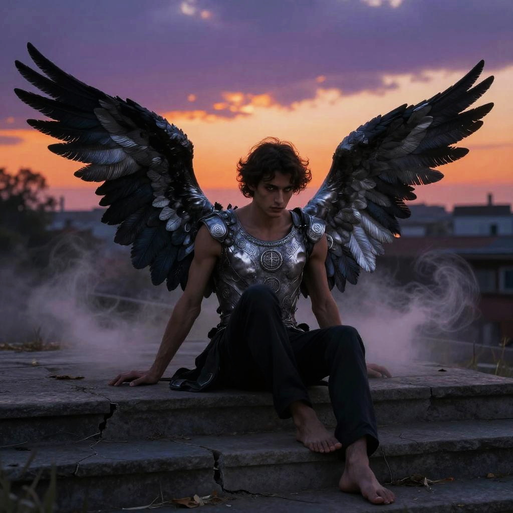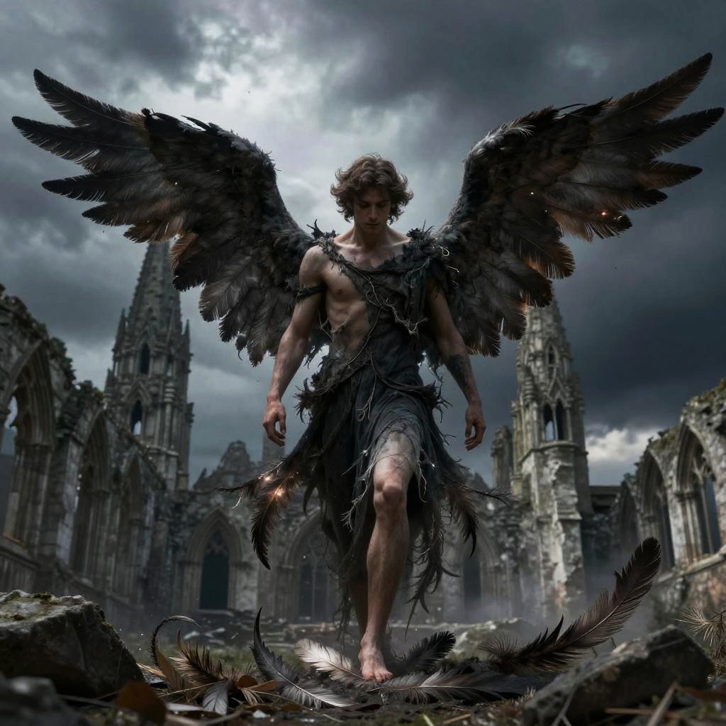 Beautiful fallen male angel kneeling in a dark forest clearing, shredded wings glowing faintly with silver light, surrounded by fallen leaves and broken chains, somber and reflective mood, soft light filtering through ancient trees, mystical realism style.