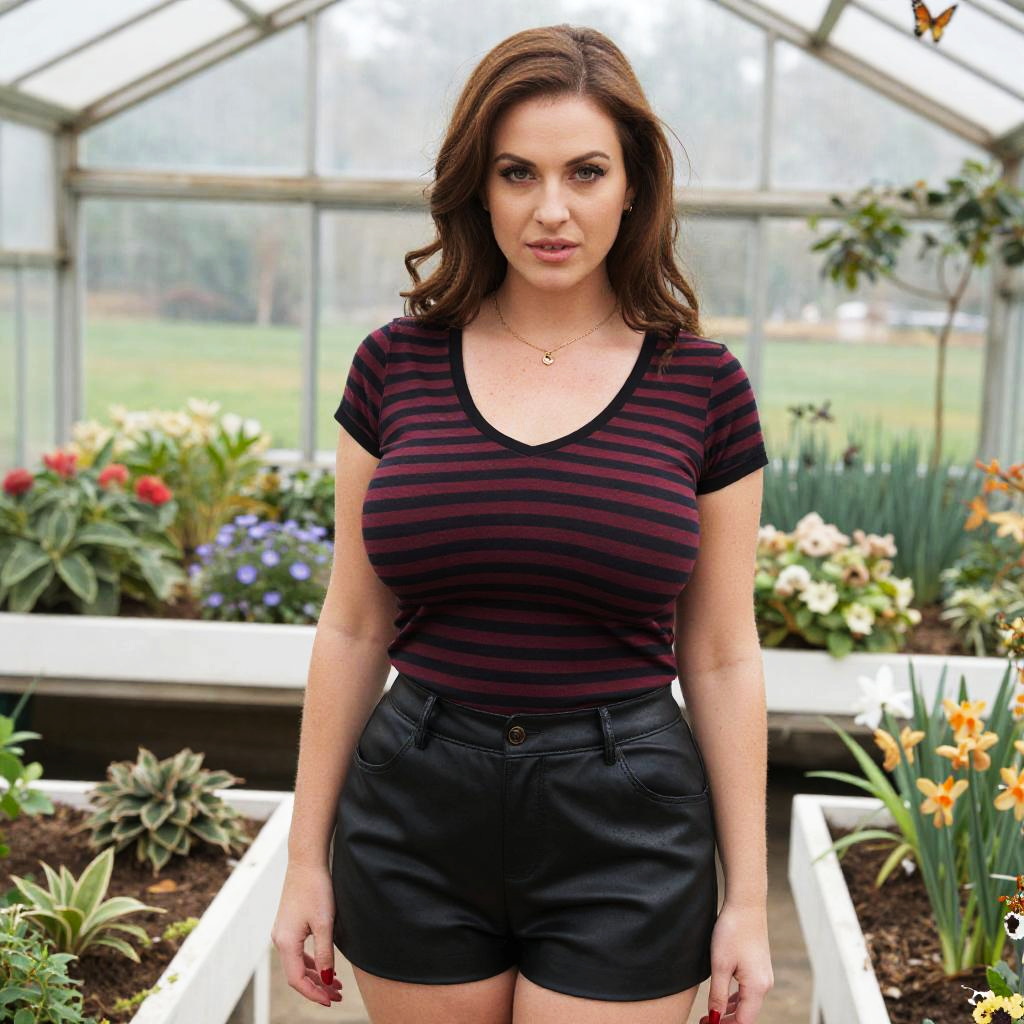 Photograph of a brunette woman with wavy hair, large breasts, wearing a black and purple striped shirt and black shorts, standing in a vibrant greenhouse