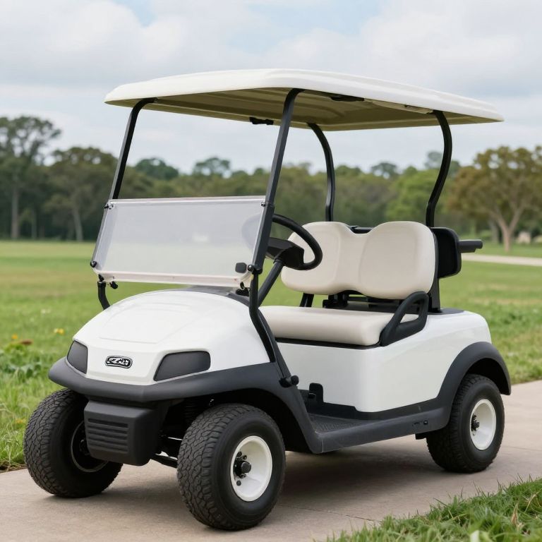 Photograph of a white golf cart with black accents and white seats, parked on a grassy path in a park.