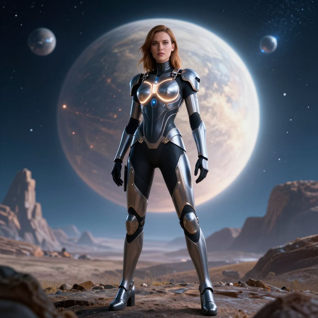 A futuristic woman stands confidently on an alien landscape with a large glowing planet and other celestial bodies in the background. She is dressed in a sleek, armored bodysuit that blends metallic and glowing elements, evoking a sci-fi cybernetic warrior aesthetic.