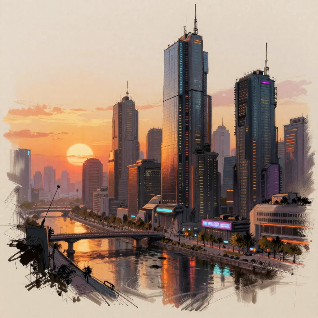 Drawing:1p83ai5jvpo= featuring a futuristic cityscape at sunset, detailed buildings with neon accents, dynamic perspective and reflective surfaces, combining pen sketches with digital painting techniques for a cyberpunk vibe