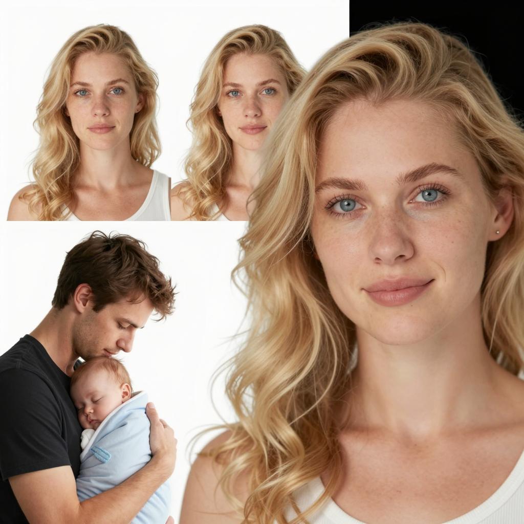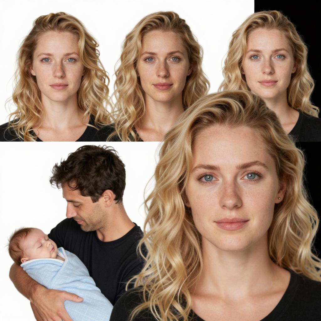 A woman with blonde curly hair and blue eyes in the foreground, smiling slightly. Three headshots of her are in the background. In the lower left, a man with short black hair holds a sleeping baby wrapped in a blue blanket against her. The background is white with a black shadow on the top right.