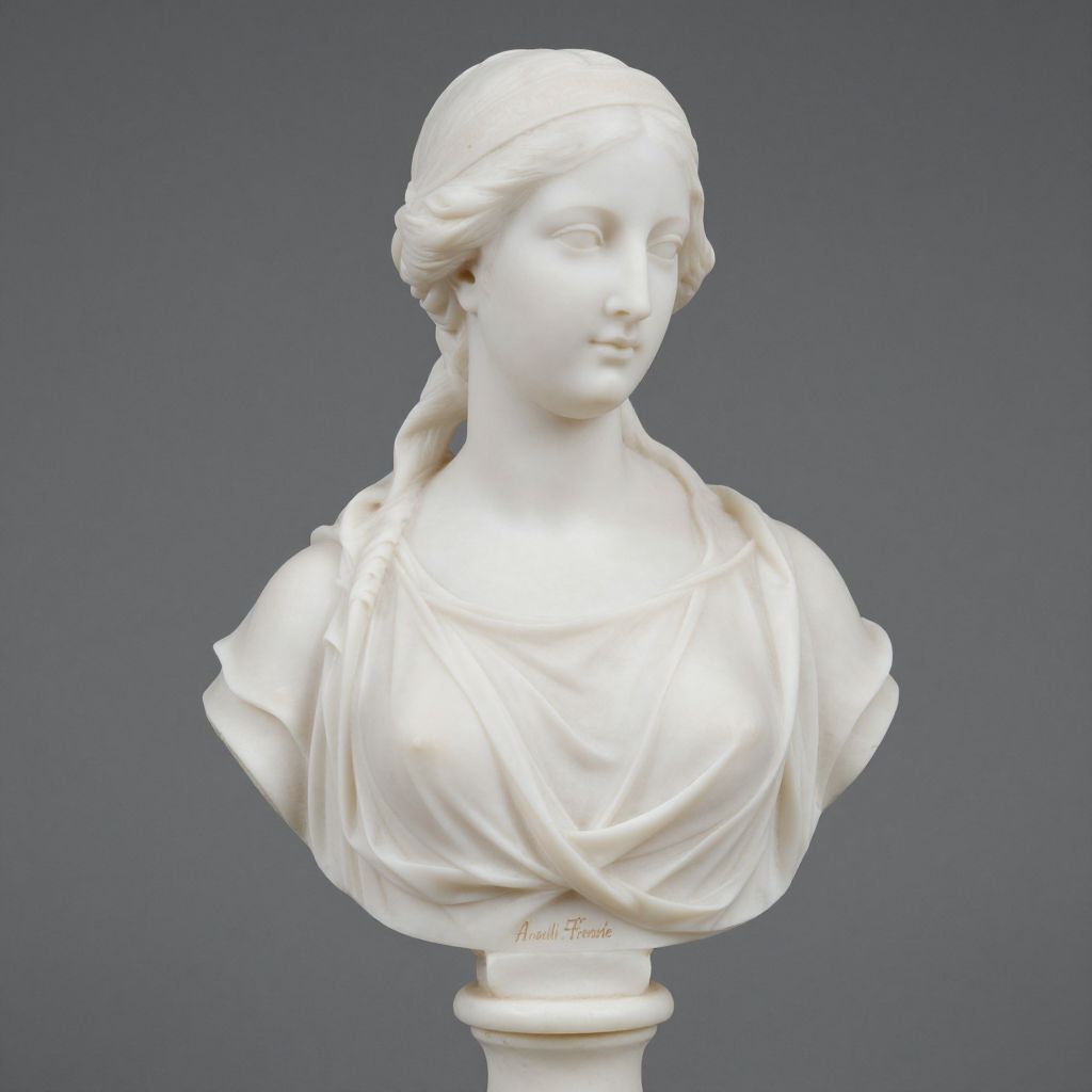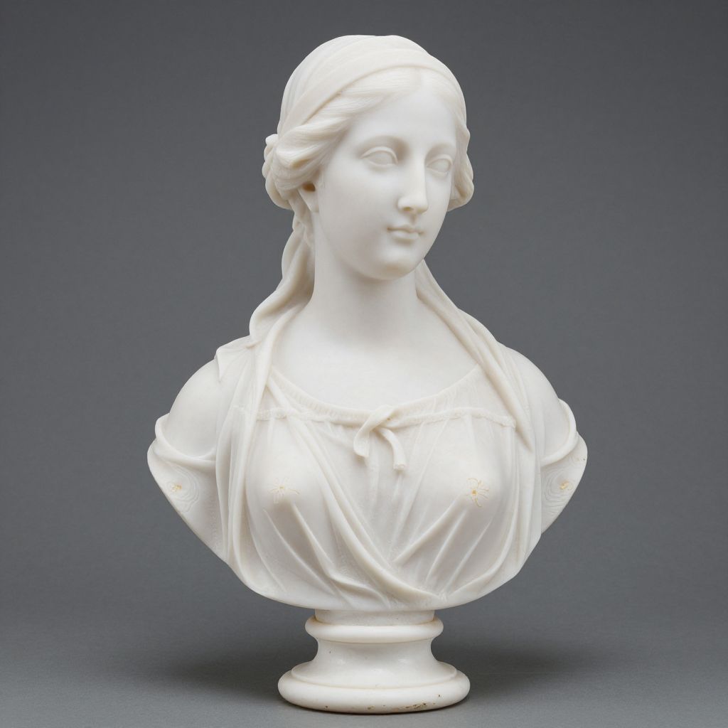 Photograph of a white marble bust sculpture depicting a serene, classical woman with draped clothing, soft features, and a calm expression.