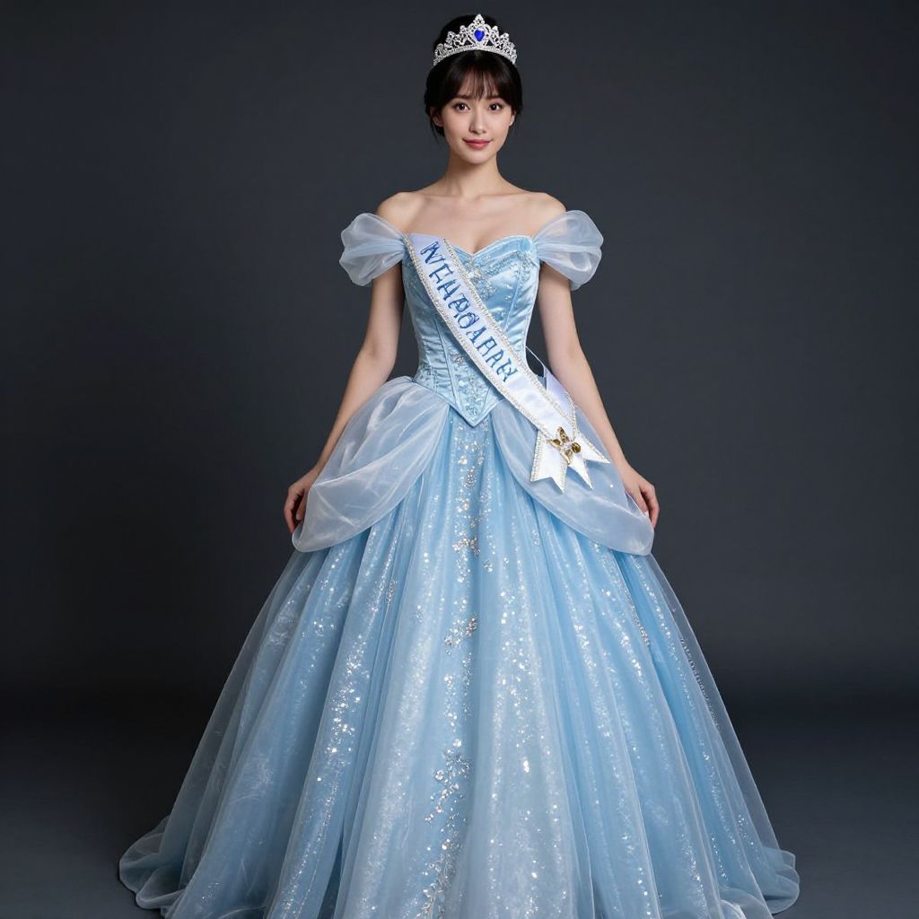 Photograph of a young Asian woman in a sparkling light blue off-shoulder ball gown with a silver tiara and sash, standing against a