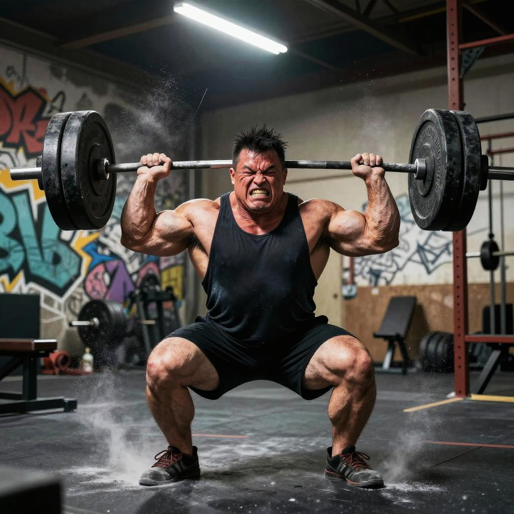 Rat lifting weights with exaggerated muscles, comic book style, intense expression, dynamic action lines, gym environment filled with chalk dust and motivational graffiti walls, strong contrast lighting emphasizing power and determination.