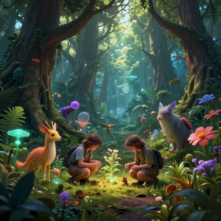 Breeders working in a mystical fantasy forest, nurturing magical creatures and rare plants, ethereal light filtering through ancient trees, detailed flora and fauna, vibrant colors, enchanting mood, highly detailed digital art.