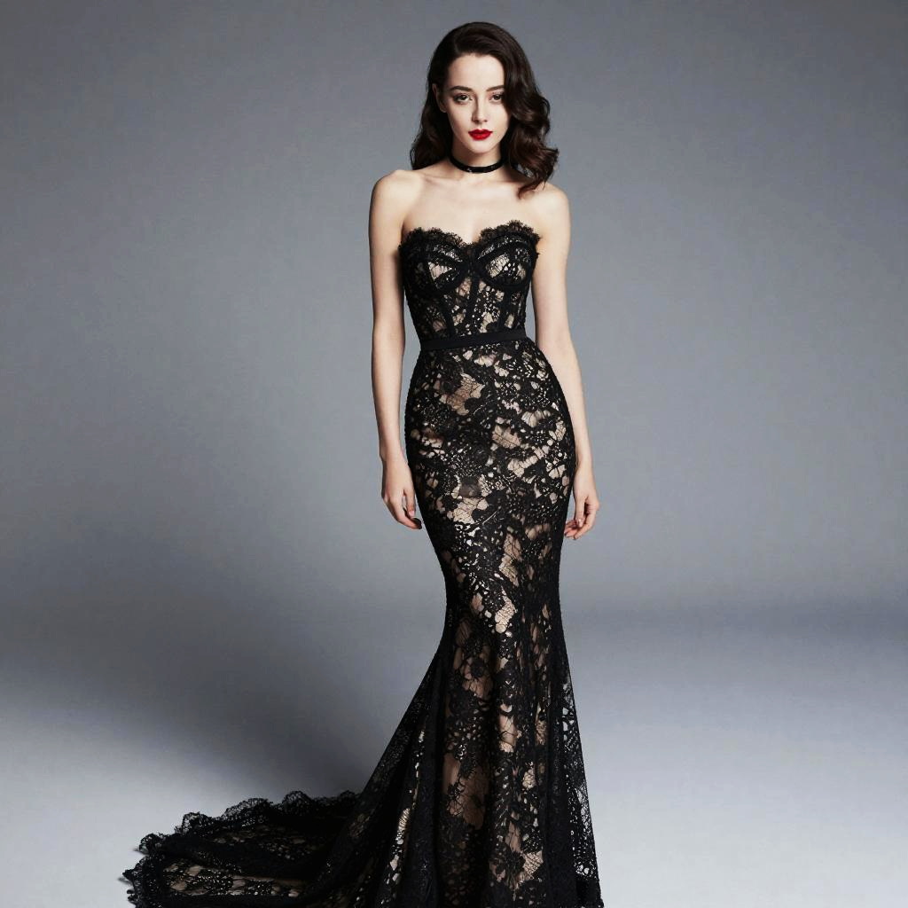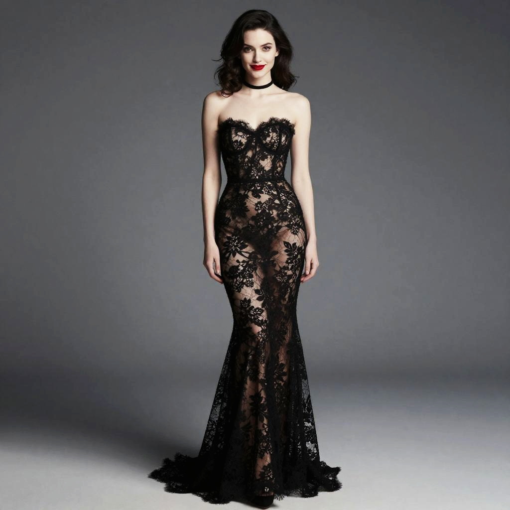 Photograph of a pale-skinned woman with dark, wavy hair, wearing a strapless, black, lace, form-fitting gown, standing