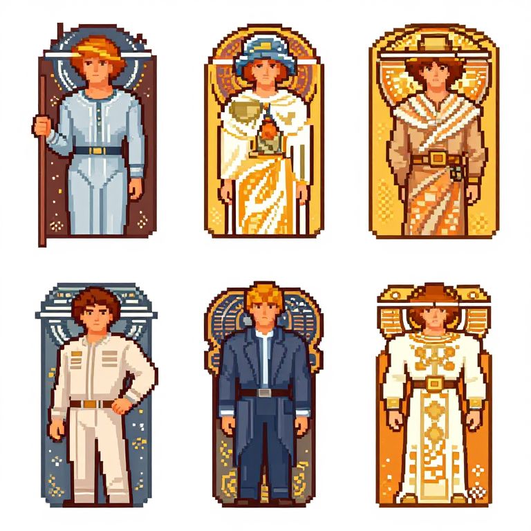 Pixel art of six characters in various outfits: two in white suits, one in a blue suit, one in a brown suit, one in white robes