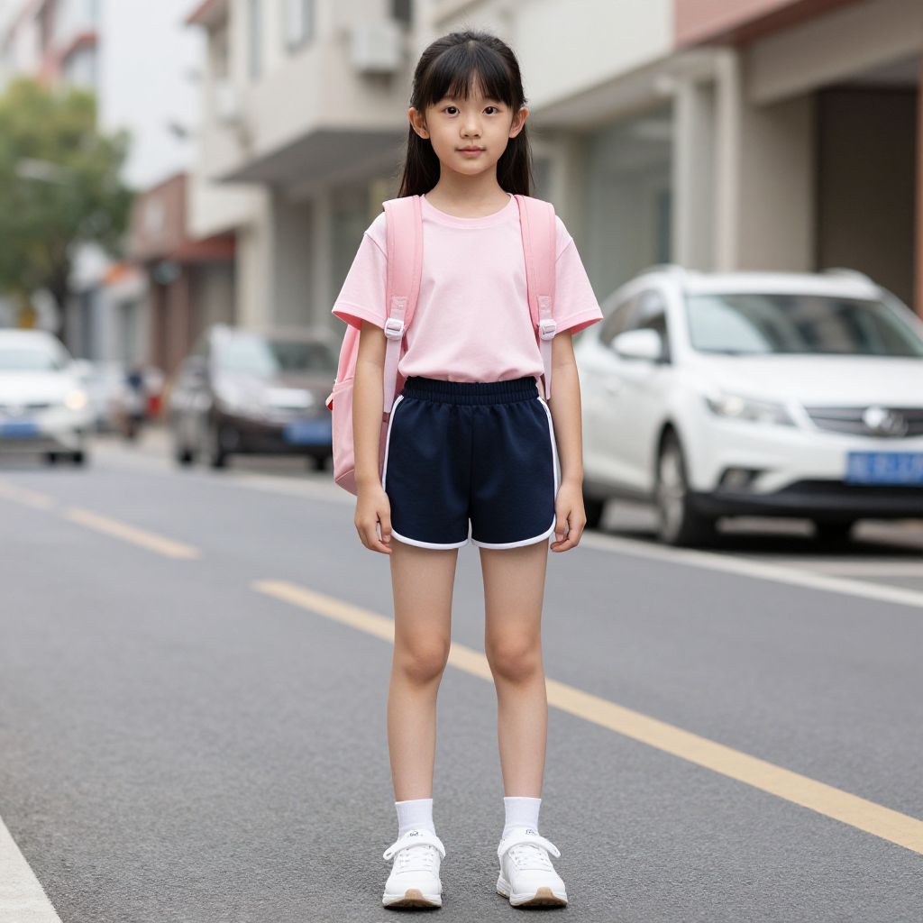 Photograph of an Asian girl standing on an urban street. She has straight black hair with bangs, wears a light pink short-sleeve shirt, black athletic shorts with white trim, white socks, and white sneakers. She carries a light pink backpack over her right shoulder. The background features blurred buildings, parked cars, and a lined road with yellow center markings. The girl stands centrally, looking directly at the camera with a neutral expression. The overall scene is brightly lit with natural daylight.