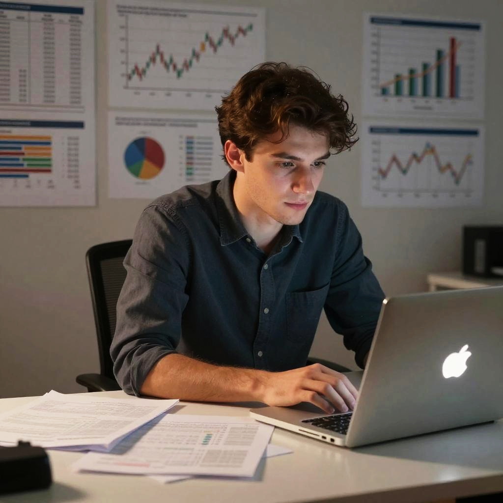 Boursier sitting at a sleek desk cluttered with stock market reports and a laptop, ambient warm light casting shadows, background filled with abstract stock market charts and graphs, artistic close-up portrait, photo-realistic style