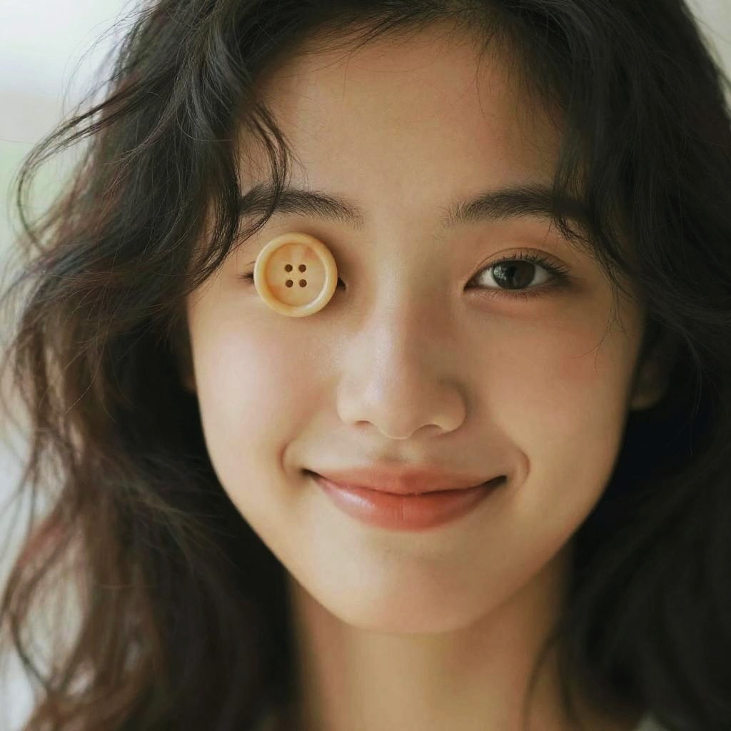 Girl button nose close-up portrait, soft natural lighting, warm skin tones, curly hair framing her face, dreamy bokeh background, gentle smile, high detail, realistic style