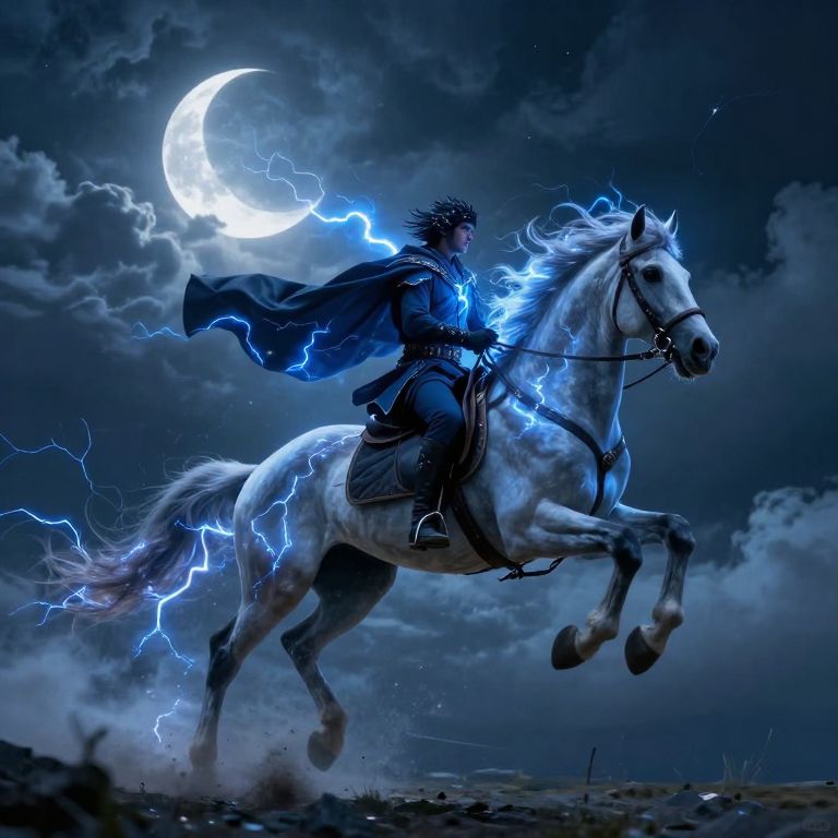 Digital art: Dark-clad warrior with blue lightning aura rides a white, galloping horse under a stormy night sky with a glowing crescent